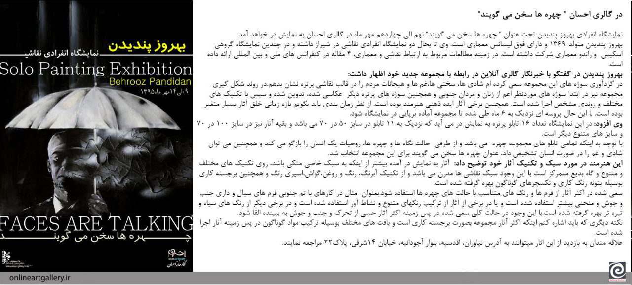 گزارش تصويري نمايشگاه نقاشي بهروز پنديدن با عنوان “چهره ها سخن مي گويند” در گالري احسان(9 مهر 95)از گالری آنلاین / اکتبر 2, 2016 اخبار مرتبط: در گالري احسان " چهره ها سخن مي گويند"