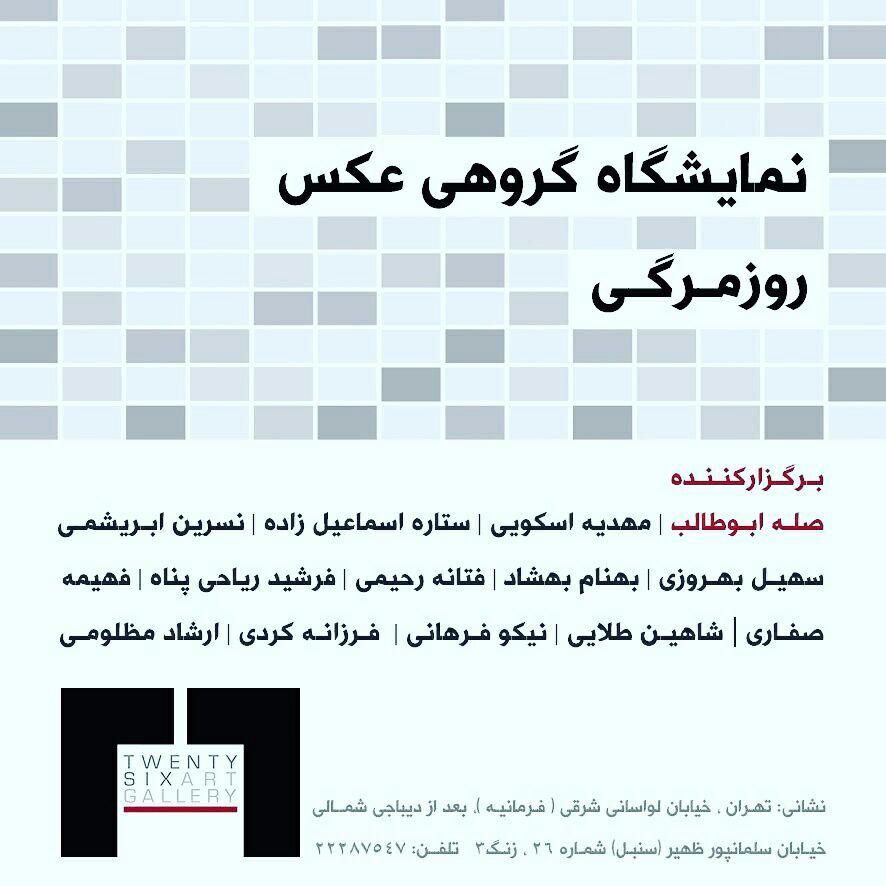 به گزارش گالري آنلاين ،نمايشگاه گروهي عکس روزمرگي از روز جمعه ٢٠ فروردين ١٣٩٥ از ساعت ٤ الى ٨ در گالري 26 گشايش يافت و تا روز ٢٥ فروردين ، از ساعت ٣ الى ٨داير مى باشد.