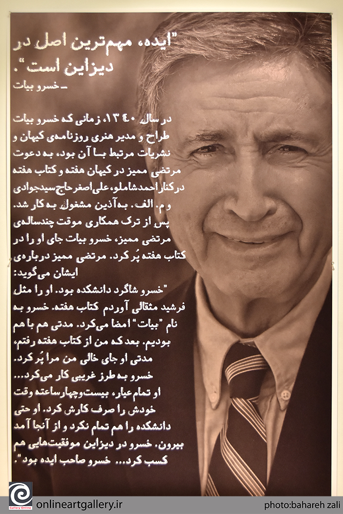 به گزارش گالري آنلاين، متنخبي از آثار خسرو بيات که از همکاران و هم دورهاييهاي مرتضي مميز در کتاب هفته به شمار ميرود از جمعه سوم آذرماه در گالري ميرميران خانه هنرمندان به نمايش درآمده. مجموعه آثار او که شامل 35 پوستر و آگهي تبليغاتي است به انتخاب مجيد عباسي در معرض ديد مخاطبان قرار گرفته است.