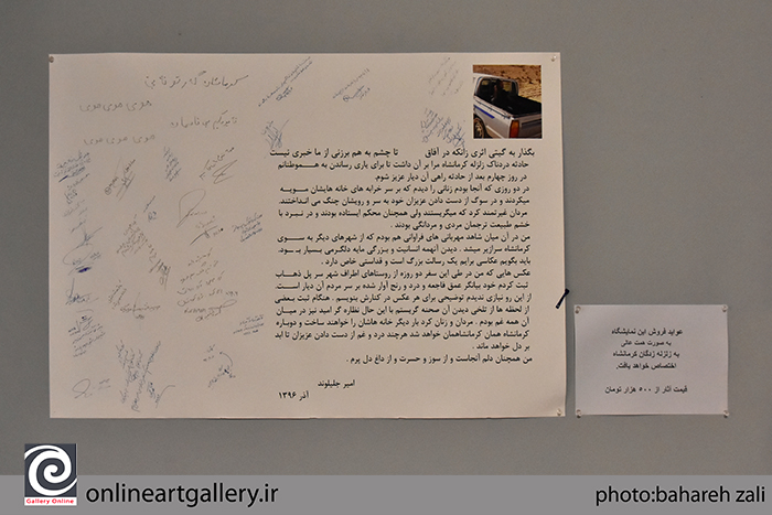 به گزارش گالري آنلاين، نمايشگاه عکسهاي امير جليلوند از مناطق زلزله زده کرمانشاه، با عنوان «کرماشان»، يکشنبه پنجم آذر در گالري تابستان خانه هنرمندان ايران افتتاح شد و تا دهم آذرماه ادامه خواهد داشت.