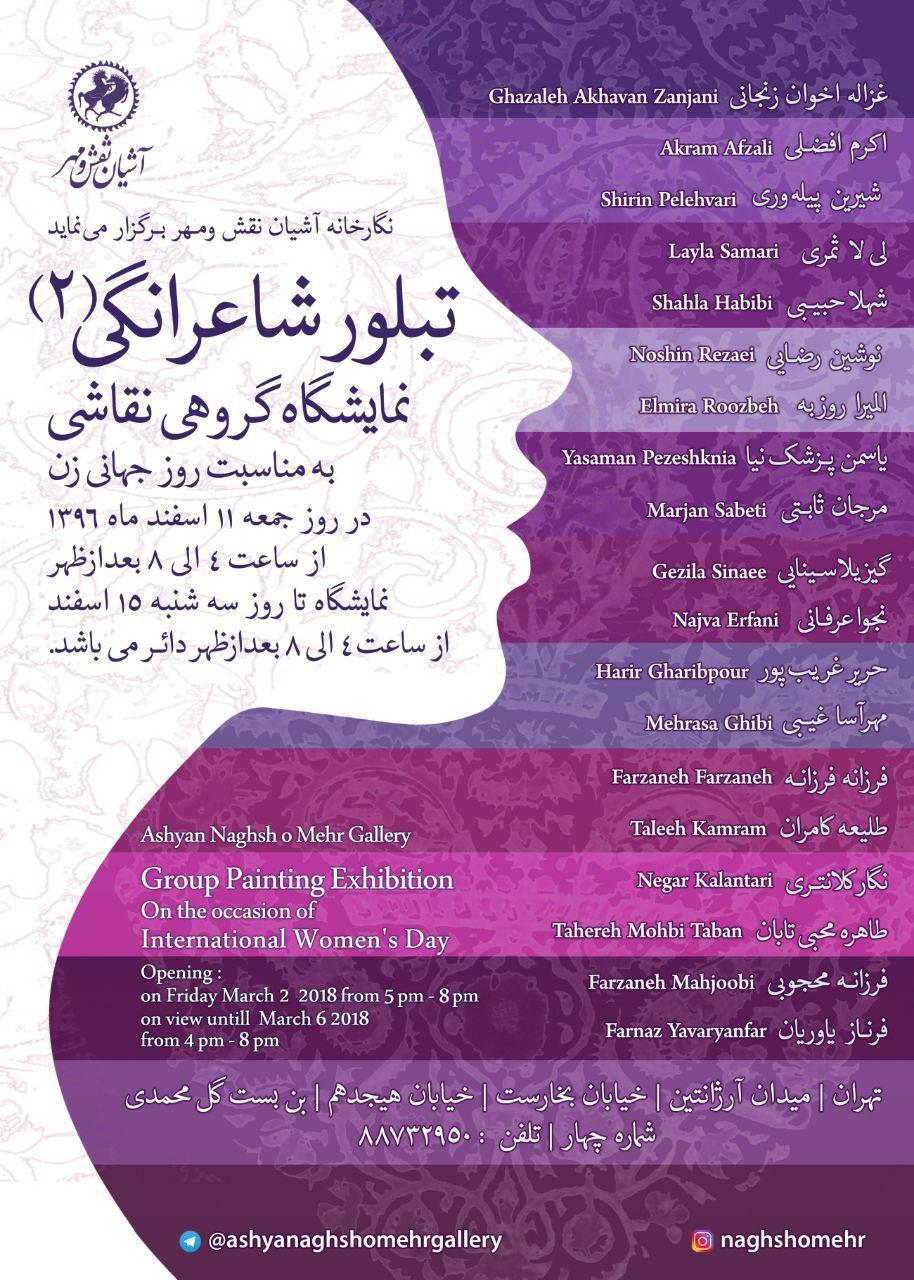 نمايشگاه گروهي زنان هنرمند نقاش به مناسبت روز جهاني زن تحت عنوان "تبلور شاعرانگي 2" جمعه يازدهم اسفندماه در نگارخانه آشيان نقش و مهر برگزار شد و تا پانزدهم اسفندماه ادامه خواهد داشت.