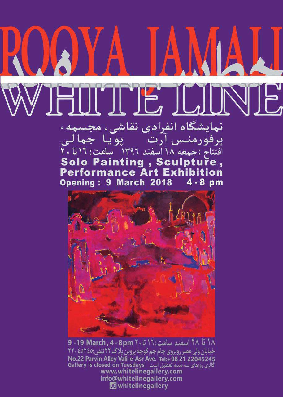 گالري خط سفيد از روز جمعه 18 اسفند ماه 96 ميزبان آثار هنرمند نقاش، عکاس، مجسمه ساز و فعال حيطه هنرهاي جديد، پويا جمالي شد. جمالي در اين نمايشگاه ضمن به نمايش گذاشتن آثار نقاشي و مجسمه خود، اقدام به اجراي يک پرفورمنس نيز نمود.