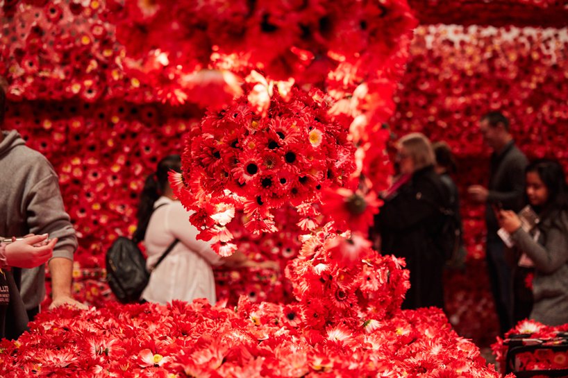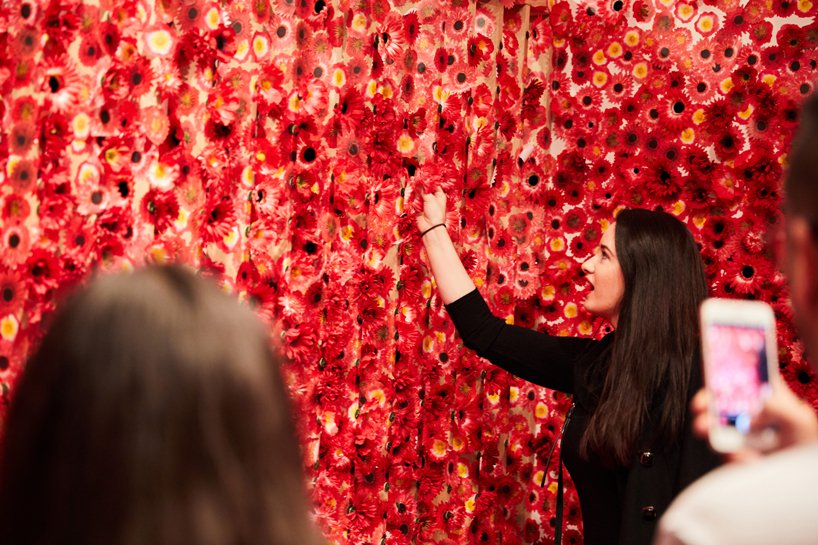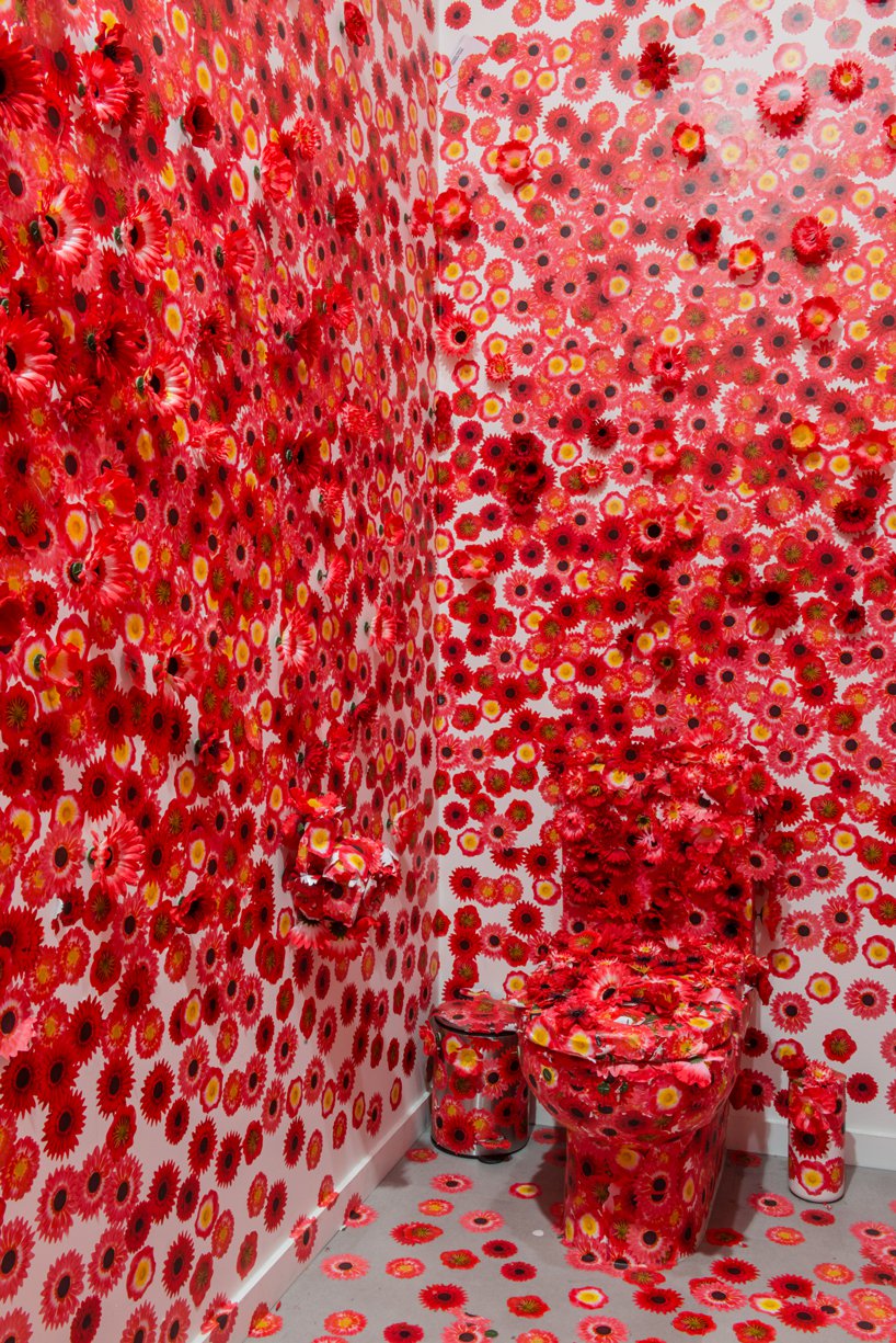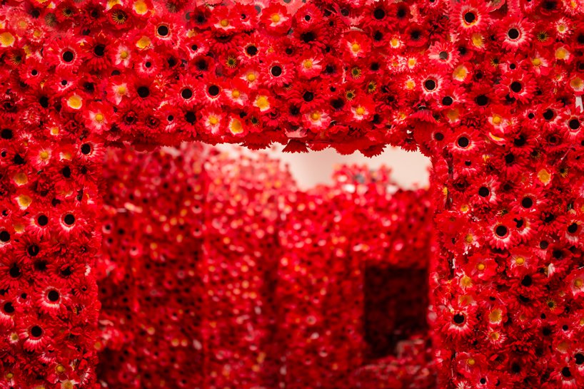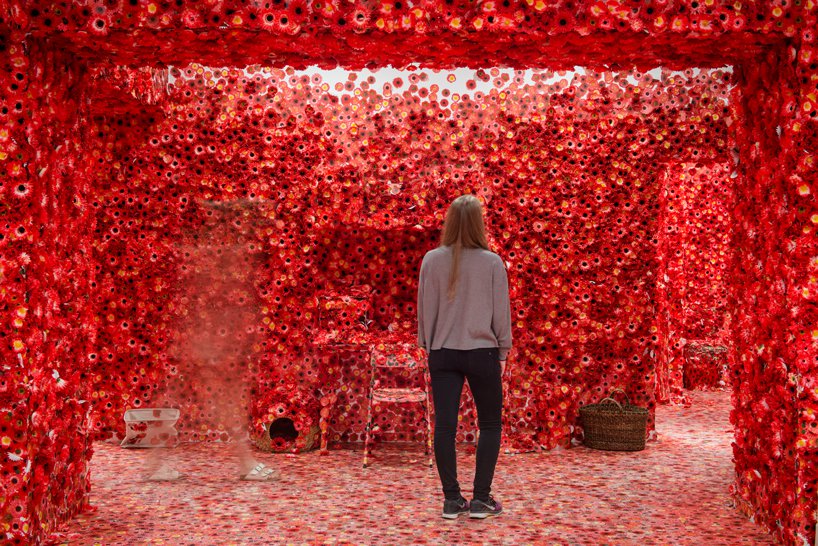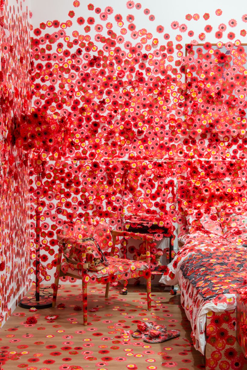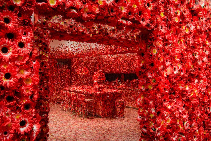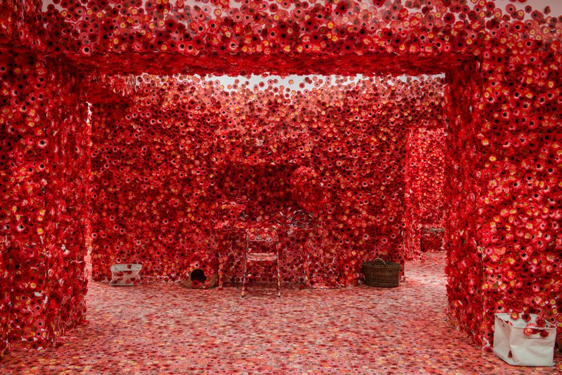 ويروس عنوان اثر چيدمان yayoi kusama است که ذهنيت خود از گسترش و فراگيري ويروس در محيط را با استفاده از پوشش گل در فضاي اتاق نشان داده است.