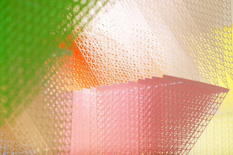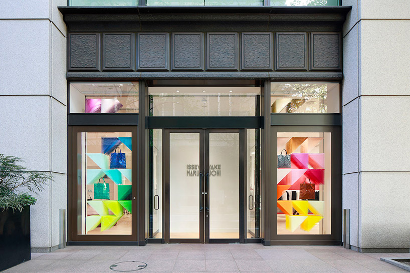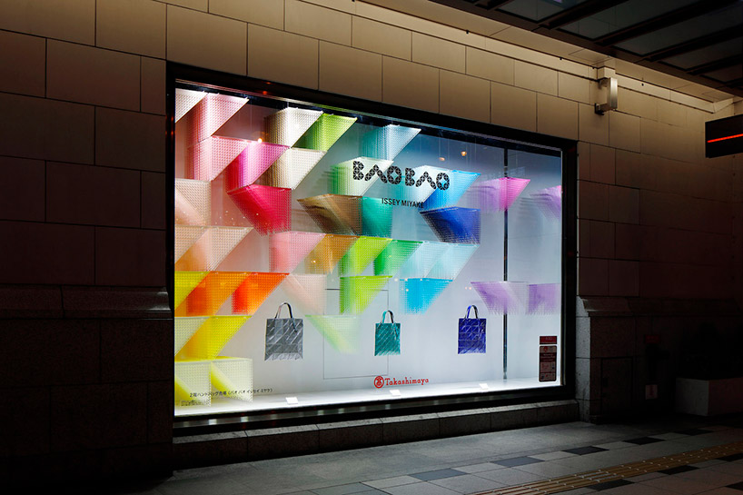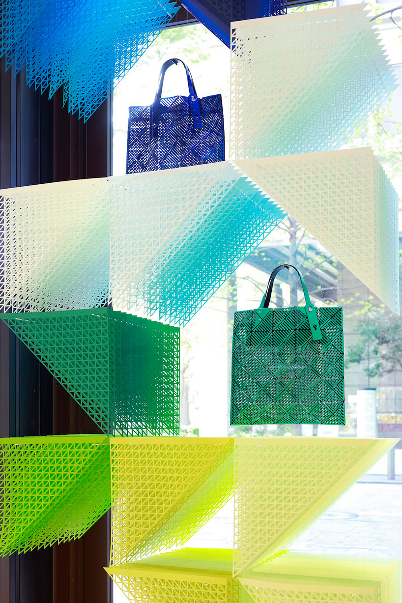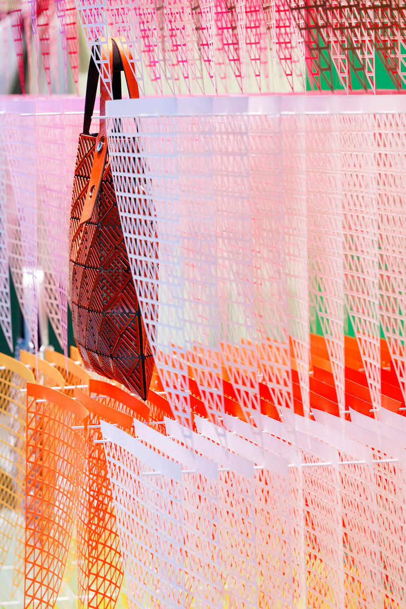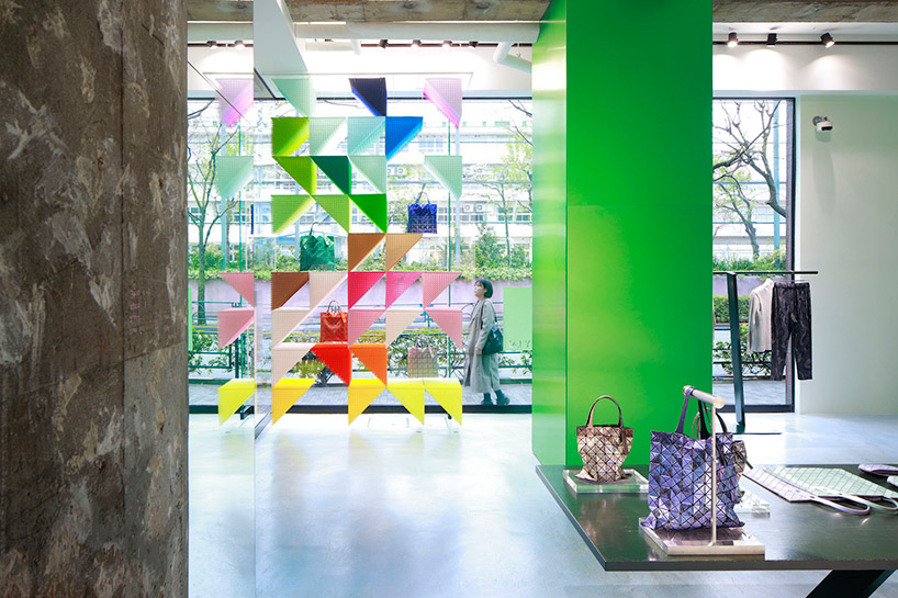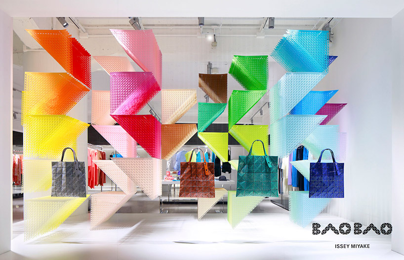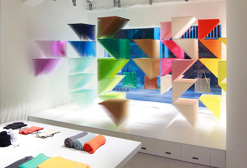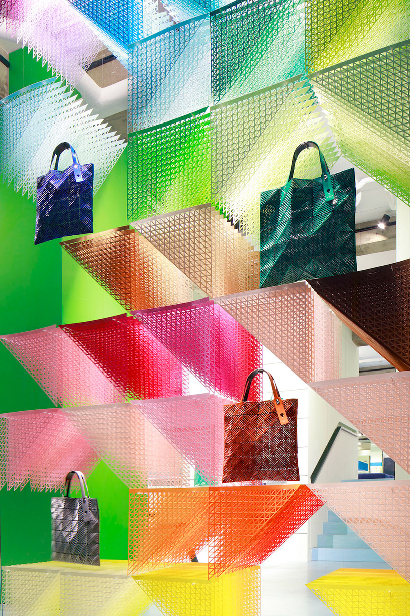 معمار و هنرمند فرانسوي emmanuelle moureaux در طراحي داخلي يک فروشگاه کيف فروشي از ترکيب رنگين کماني که متشکل از مثلث هاي رنگي است، استفاده نموده.