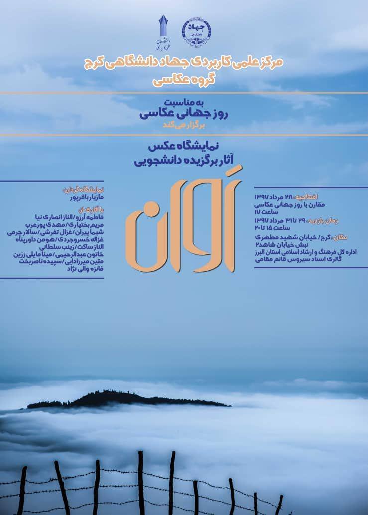 نمايشگاه گروهي عکس "اوان" با آثاري از دانشجويان برتر جهاد دانشگاهي به نمايشگاه گرداني مازيار باقرپور روز گذشته مقارن با روز جهاني عکاس در گالري استاد سيروس قائم مقامي اداره کل فرهنگ و ارشاد اسلامي استان البرز افتتاح شد.