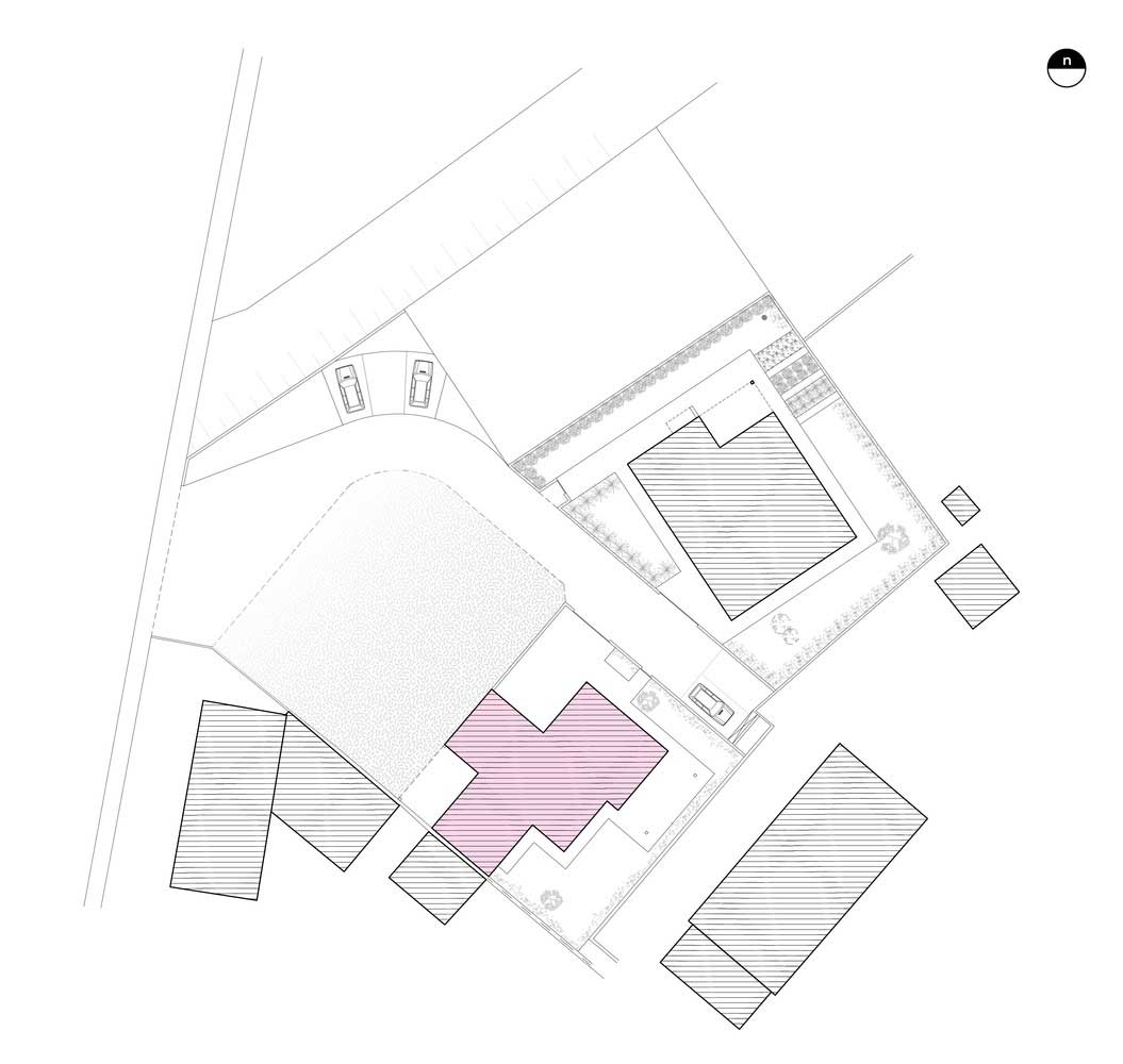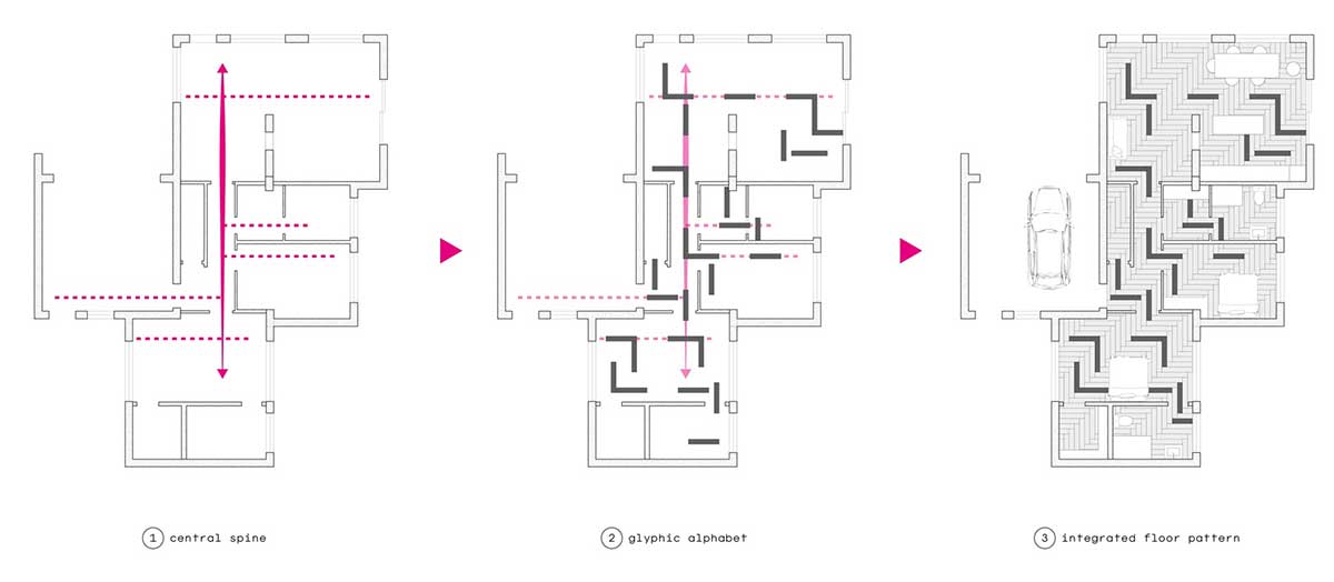 تعبيه المان هاي معماري به عنوان شيوه اي براي جاسازي سيستم نقشه خانه يک راه حل هوشمندانه و ساده جهت مديريت کارفرما بود. اولين گام طراحي اين بود که راهروهاي انحصاري را در طول خانه به حداقل برسانيم تا يک سير حرکتي بالقوه در سراسر خانه تامين شود. در سه نقطه مرکزي اصلي خانه ورودي هاي قرار گرفته اند که به عرصه هاي گاراژ، درب اصلي و پاسيو پشتي هدايت شده اند.راهروي اصلي مرکزي به دو فضاي اتاق خواب آشپزخانه متصل شده است. عرصه هاي فوق توسط گره هايي در طول مسير براي عرصه هاي اتاق مهمان، حمام و اتاق نشيمن هدايت شده اند.