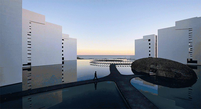 هتل Mar Adentro در اصل توسط معماري مکزيکي، مايکل آنجلو آراگونس طراحي شده بود. اما با بازسازي و مرمت هاي صورت گرفته ما را با مجموعه اي کاملا مينيمال روبرو مي کند که مانند قايق هاي مکعبي بر روي آب معلق است. ميزان جزئيات بين حجم ساختمان هاي سپيد و لبه آب به حدي دقيق است که انگار مجموعه بر روي آب ساخته شده است.