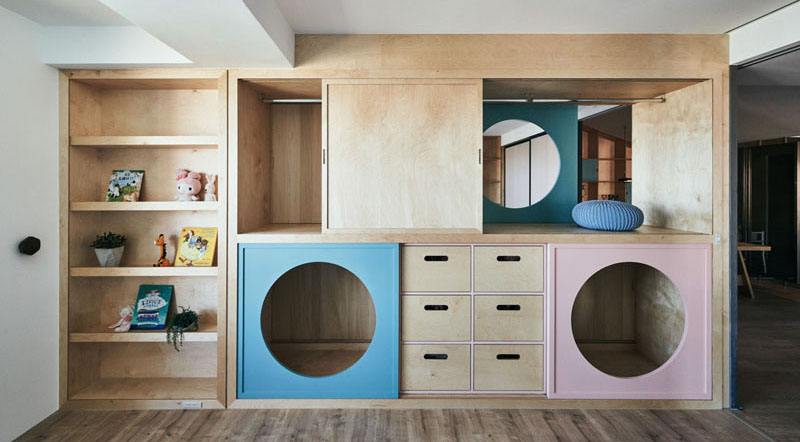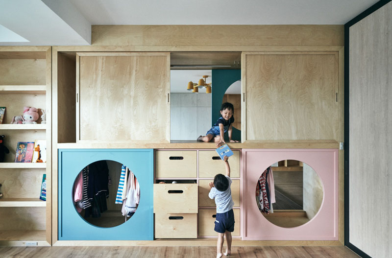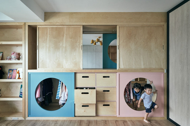 گروه طراحي و معماران HAO کمد لباسي منحصر به فرد طراحي و اجرا نموده که توسط آن اتاق بازي کودک را به اتاق خواب کودکان متصل مي کند. درب هاي گرد به نحوي طراحي شده اند که به کودکان اجازه مي دهند تا به راحتي از ميان اتاق ها عبور کنند و از لذت بازي، کشف و جستجو در فضا لذت ببرند.