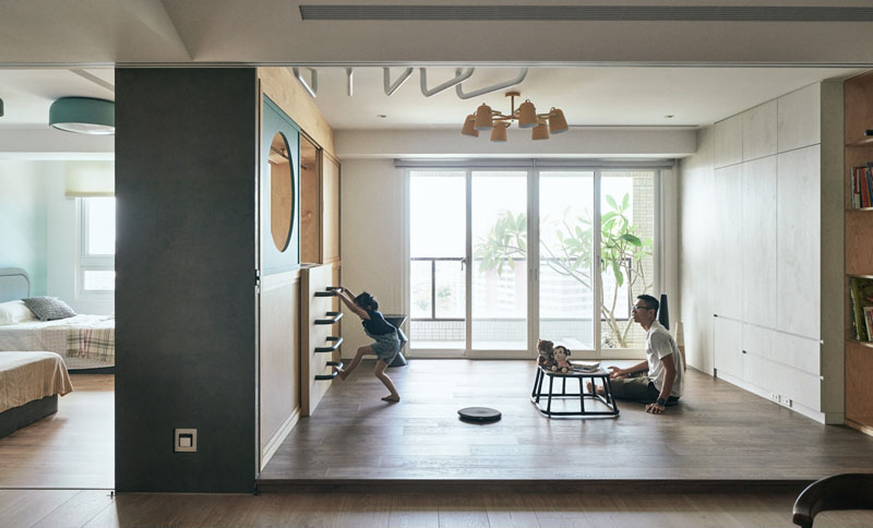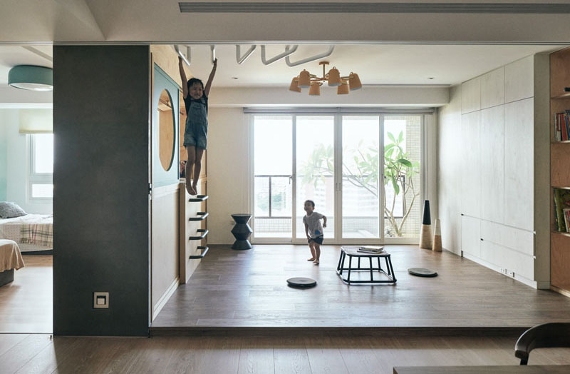 به گزارش گالري آنلاين به نقل از دکوبوم، دکوراسيون اين آپارتمان در کاوشيون، تايوان واقع شده و به جاي يک ديوار صلب که دو اتاق را کاملا از هم مجزا سازد مکاني براي بازي کودکان و براي در نظر گرفتن احساسات کنجکاوانه و رشد خلاقيت و بازي آن ها طراحي نموده است.
