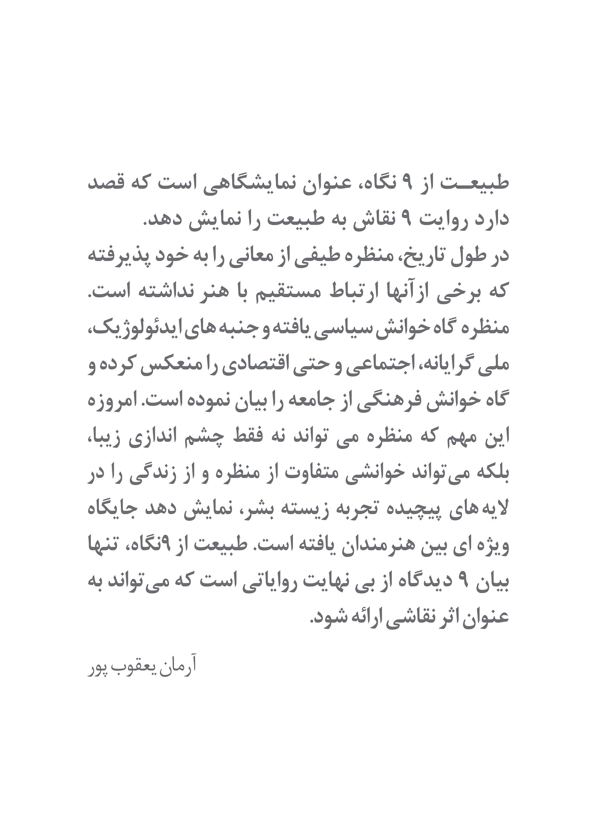طبيعت از 9 نگاه، تنها بيان 9 ديدگاه از بي نهايت رواياتي است که ميتواند به عنوان اثر نقاشي ارائه شود.