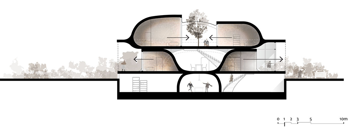در اين پروژه اين سوال مطرح شد که ساختار طاق و قوسي چگونه مي تواند به شکلي توسعه يابد که فضايي مکعب شکل را دربرگيرد؛ به عبارت ديگر چگونه مي شود حجمي با مرز هاي مکعب، به واسطۀ ساختارهاي برگرفته از چهارطاقي، هم به تفکيک فضا بپردازد و هم راه حلي براي سازۀ خود داشته باشد؟ آيا اين ساختارهاي گنبدي شکل مي توانند جوابي براي سبک زندگي عمومي و خصوصي در خانه داشته باشند؟ امکانات اين دو رگه گي چه چيزهايي ست؟
