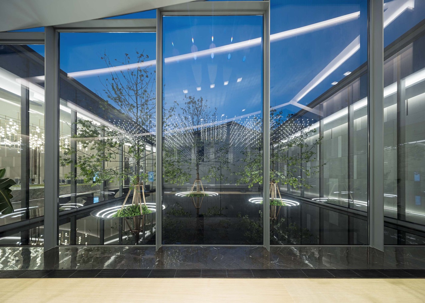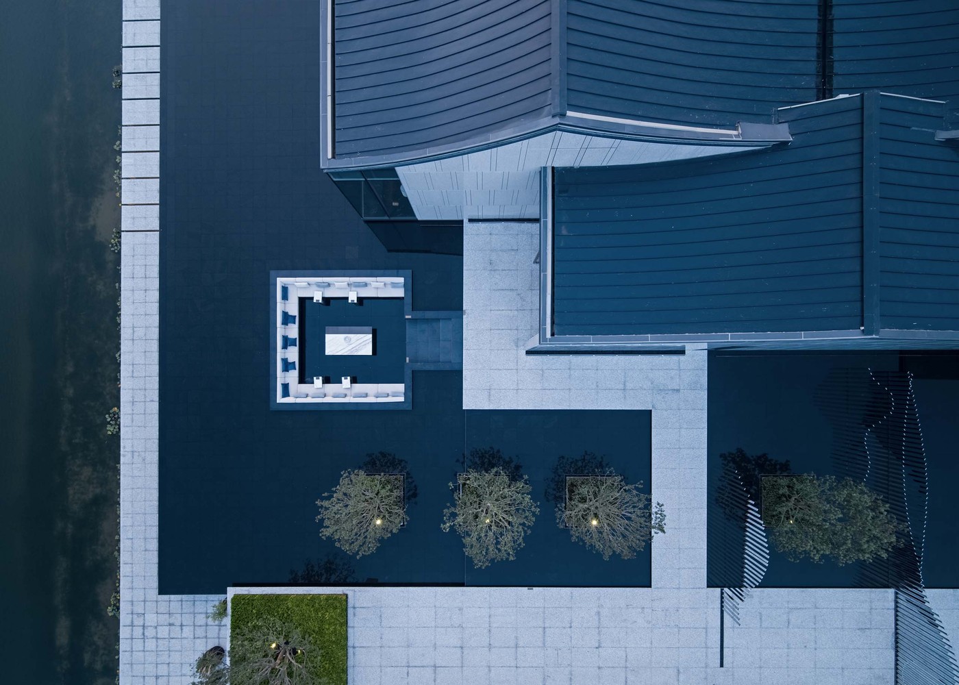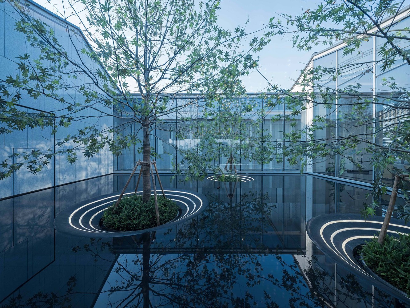 پاسيو در حياط سنتي ساختمان هاي چيني بر معنويت و حس تعلق خاطر فضا تاکيد دارد. همچنين ساختمان و طرح نماي بيروني آن به اين مفهوم پاسخ مي دهد. به طور کلي ساختمان مانند يک قلعه مدرن توسط آب محصور شده و مهم ترين بخش آن به حياط مرکزي منتهي مي شود. دهانه هاي ديوار حياط خلوت توسط ديوارهاي شيشه اي پوشيده شده تا نور آب بر عرصه هاي داخلي ساختمان تاثير مستقيم بگذارند. باغ درون حياط خلوت تجربه اي متفاوت نسبت به باغ هاي پر پيچ و خم به ما مي دهد. سه درخت سنتي که غرق در آب هستند و با توجه به اقليم و ويژگي هاي درون حياط انتخاب شده اند، مفهوم باغ سنتي چيني را در قالبي مينيمال و ساده به نمايش گذاشته است.