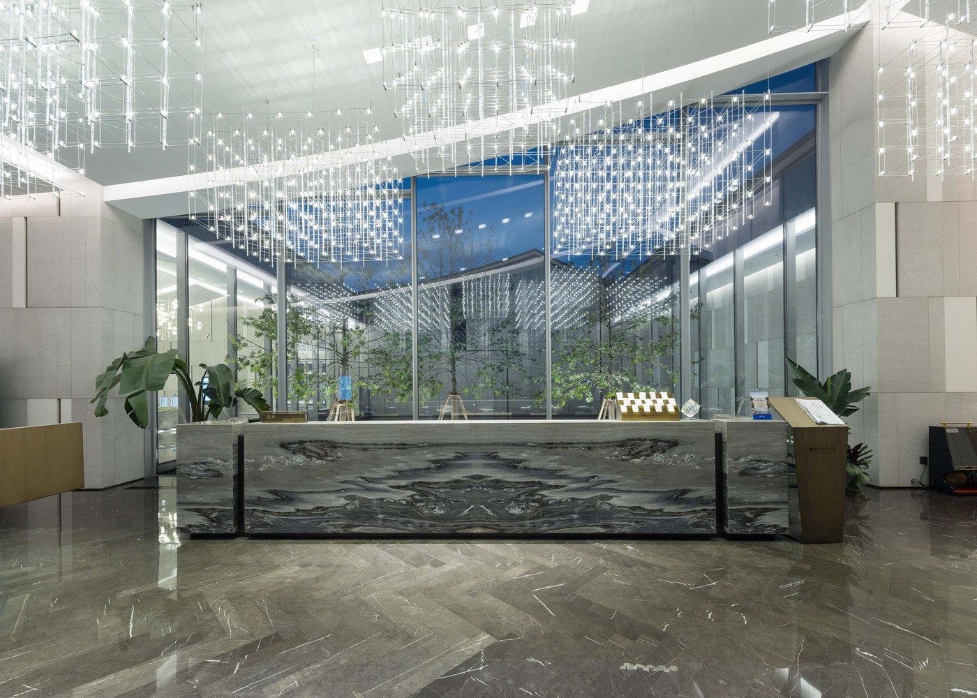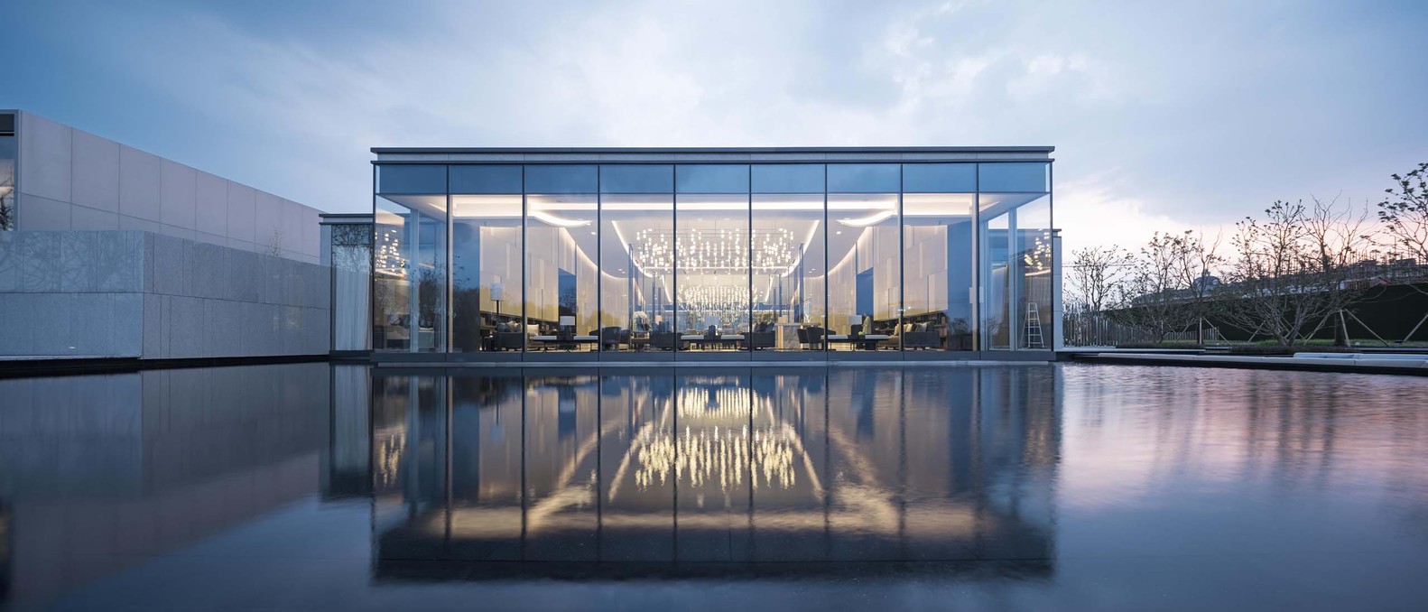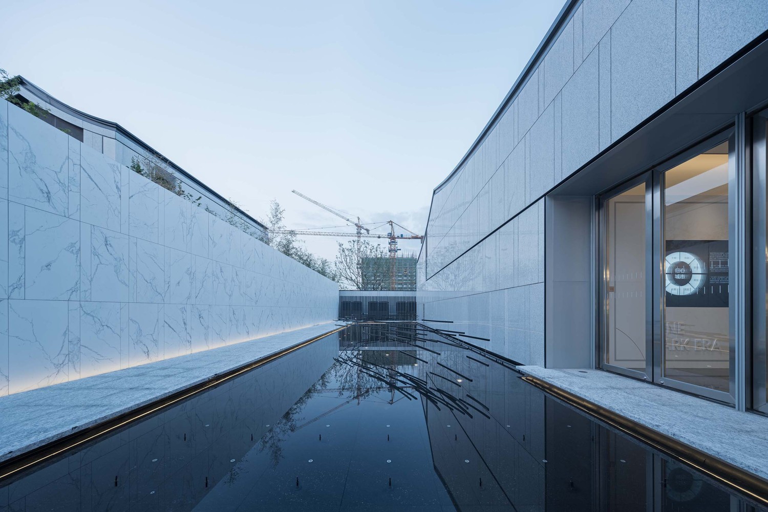 پاسيو در حياط سنتي ساختمان هاي چيني بر معنويت و حس تعلق خاطر فضا تاکيد دارد. همچنين ساختمان و طرح نماي بيروني آن به اين مفهوم پاسخ مي دهد. به طور کلي ساختمان مانند يک قلعه مدرن توسط آب محصور شده و مهم ترين بخش آن به حياط مرکزي منتهي مي شود. دهانه هاي ديوار حياط خلوت توسط ديوارهاي شيشه اي پوشيده شده تا نور آب بر عرصه هاي داخلي ساختمان تاثير مستقيم بگذارند. باغ درون حياط خلوت تجربه اي متفاوت نسبت به باغ هاي پر پيچ و خم به ما مي دهد. سه درخت سنتي که غرق در آب هستند و با توجه به اقليم و ويژگي هاي درون حياط انتخاب شده اند، مفهوم باغ سنتي چيني را در قالبي مينيمال و ساده به نمايش گذاشته است.