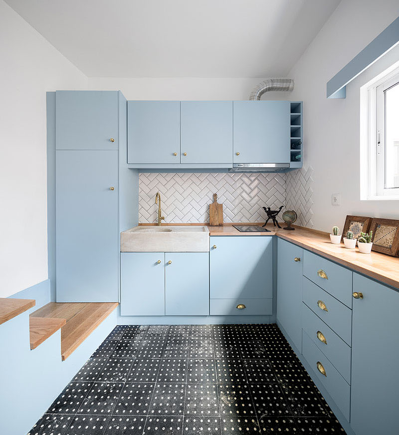 قسمت غذاخوري به آشپزخانه اي مدرن منتهي مي شود و با کابينت هاي آبي رنگ و در ترکيب با متريال چوب و کاشي هاي سفيد و تضاد بين کف مشکي خال دار فضايي دوست داشتي و ظريف ايجاد کرده است.