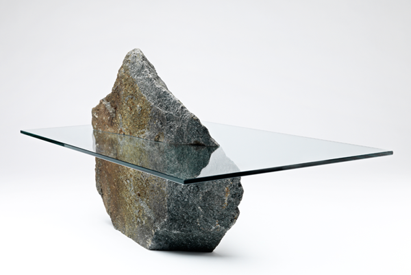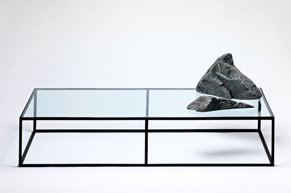طراحي ميز با ترکيب سنگ در يک ميز شيشه اي که توسط فريم هاي فلزي تيره نگه داشته شده است.