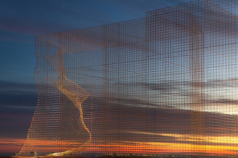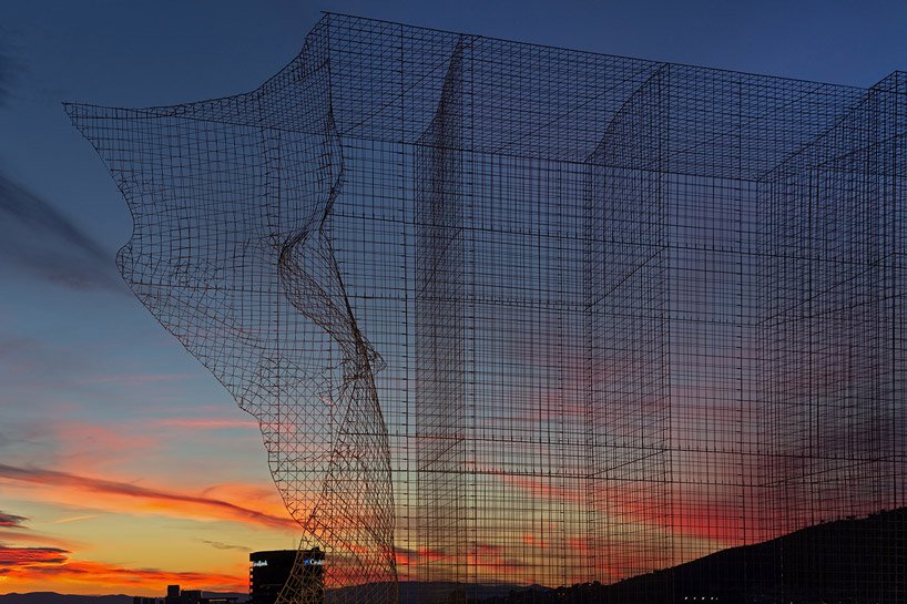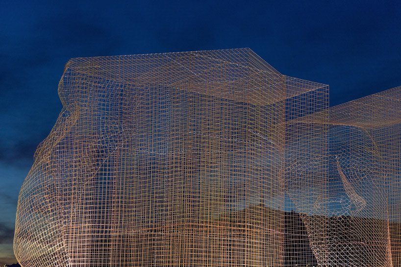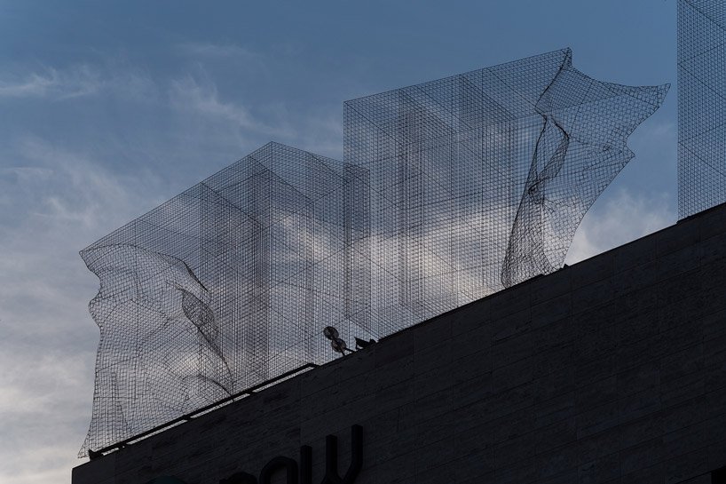 به گزارش گالري آنلاين، اين اثر با لايه اي شفاف به ارتفاع 5 و نيم متر بالاتر از سقف امتداد پيدا کرده است که با استفاده از شبکه اي از سيم، شکل چهره ها تغيير مي کند و با حرکت در اطراف ساختمان، يک کيفيت تعاملي منحصر به فرد را ايجاد ميکند.