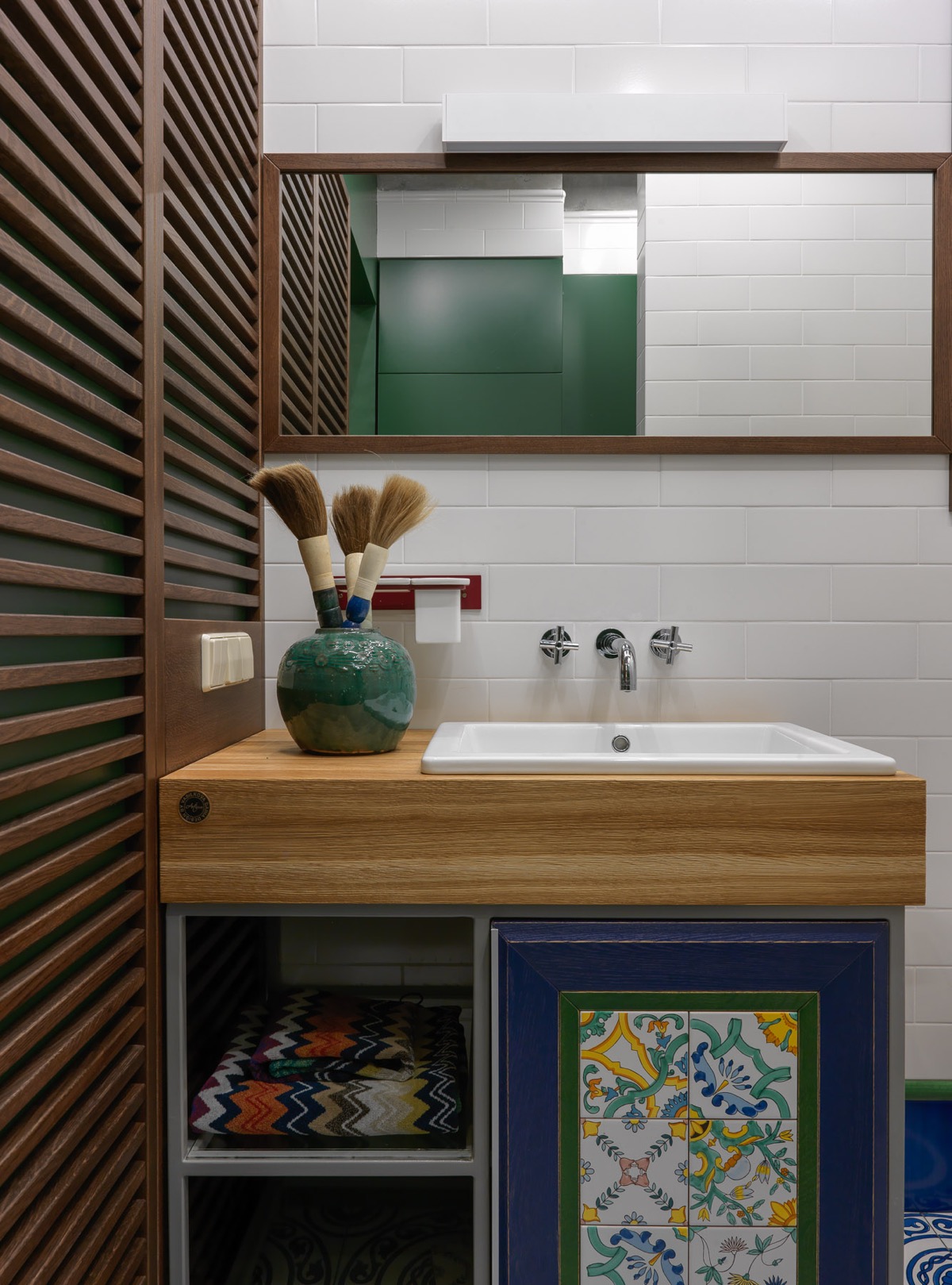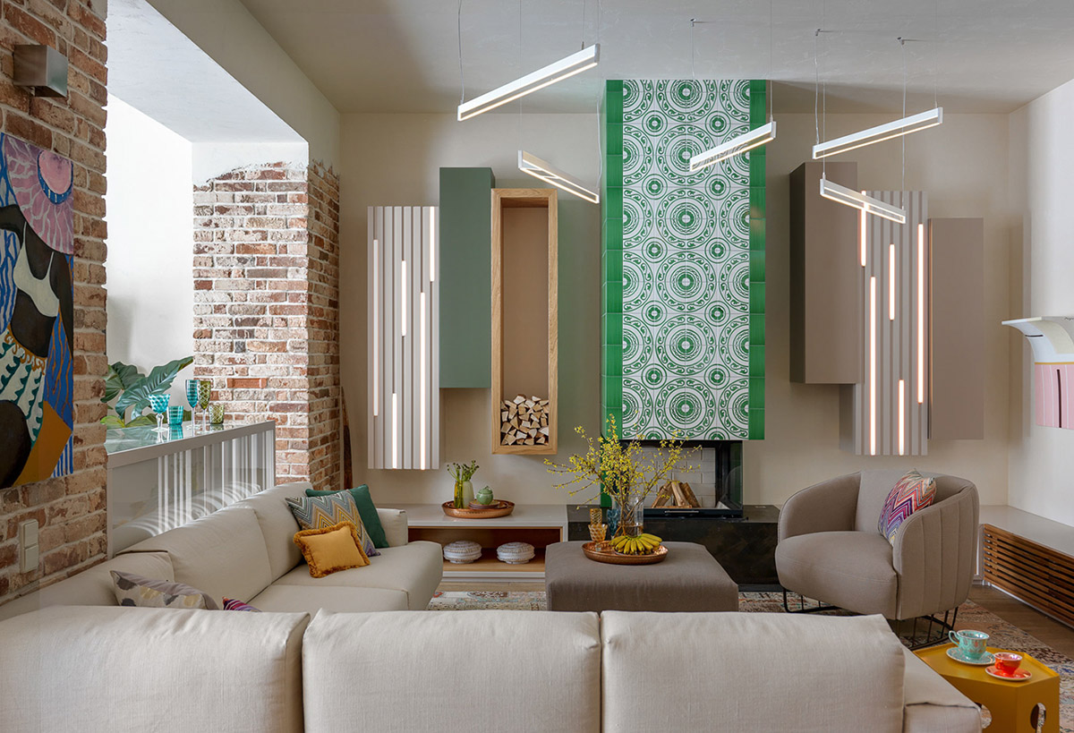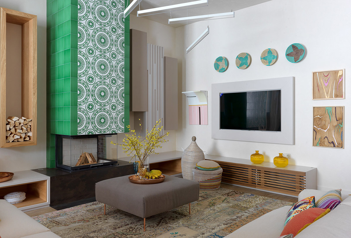 شومينه اغلب نقطه کانوني نشيمن در دکوراسيون در نظر گرفته مي شود اما در دکوراسيون اين خانه اين نقطه با طرح سبز و سفيد و به کارگيري قفسه عمودي و باکسي براي قرار دادن چوب هاي شومينه همراه شده است که اين نقطه کانوني را تاثيرگذار تر و از نظر بصري پررنگ تر نموده است.