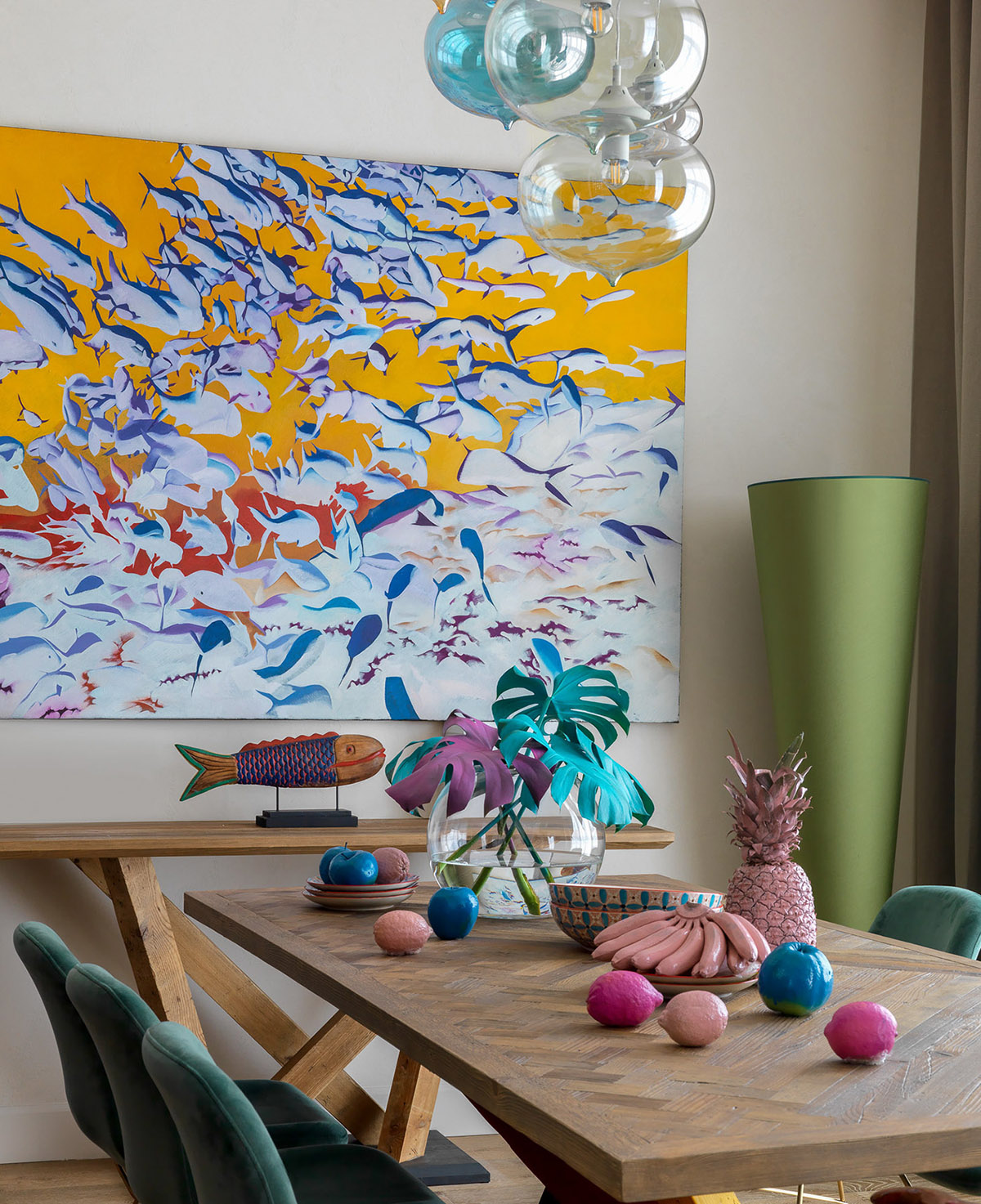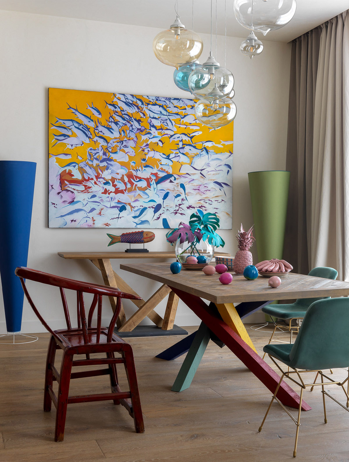 فضاي غذاخوري نيز با پايه هاي رنگي ميز و به کار گيري تابلو هنري رنگي و روشنايي هاي منحصر به فرد جلوه متفاوت و متنوع پيدا کرده و حباب هاي روشنايي هاي شفاف و شيشه اي در سقف سايه مانند جشني از نورهاي زيبا ايجاد مي کنند؛ اکسسوري ها و المان هاي دکوري به کار رفته، ميز ناهار خوري را به زيبايي تزئين کرده است و با ورود رنگ ها تنوع بصري بي نظيري ايجاد نموده.