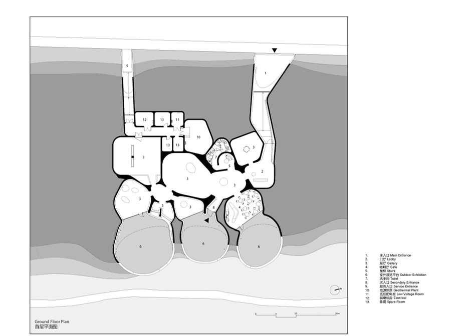 نمايشگاه ها در گفتگو با فرم منحصر به فرد ساختمان و ارتباط آن با محيط طبيعي طراحي شده اند و در حالي که فضاي بيروني موزه به طور کامل با طبيعت هماهنگ است، فضاهاي داخلي آن به عنوان يک شبکه مرموز از غارهاي ارگانيک شکل گرفته شده است.