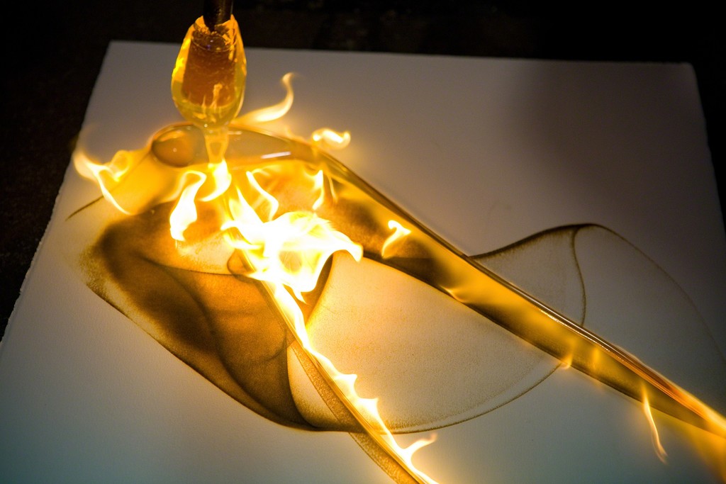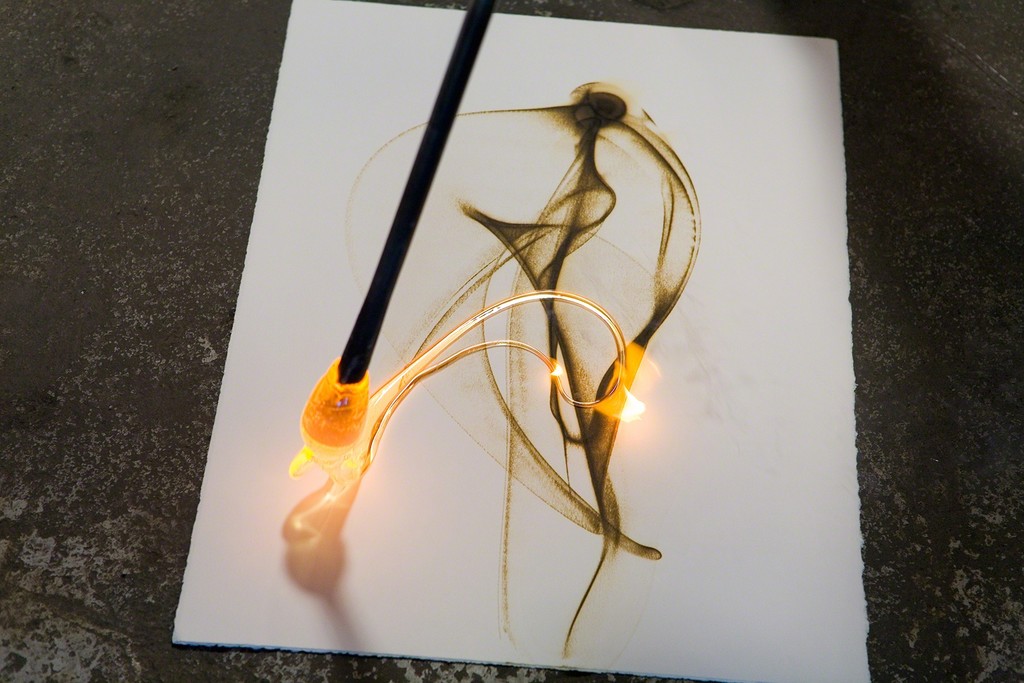 در اين آثار، شيشه ذوبشده به عنوان رنگ آتشين استفاده ميشود و سطح مخملي را ميسوزاند. وي مفاهيم انتزاعي را از برخورد اين عناصر متناقض ، آتش و کاغذ ايجاد ميکند و آن ها را با آبرنگ هدايت ميکند.