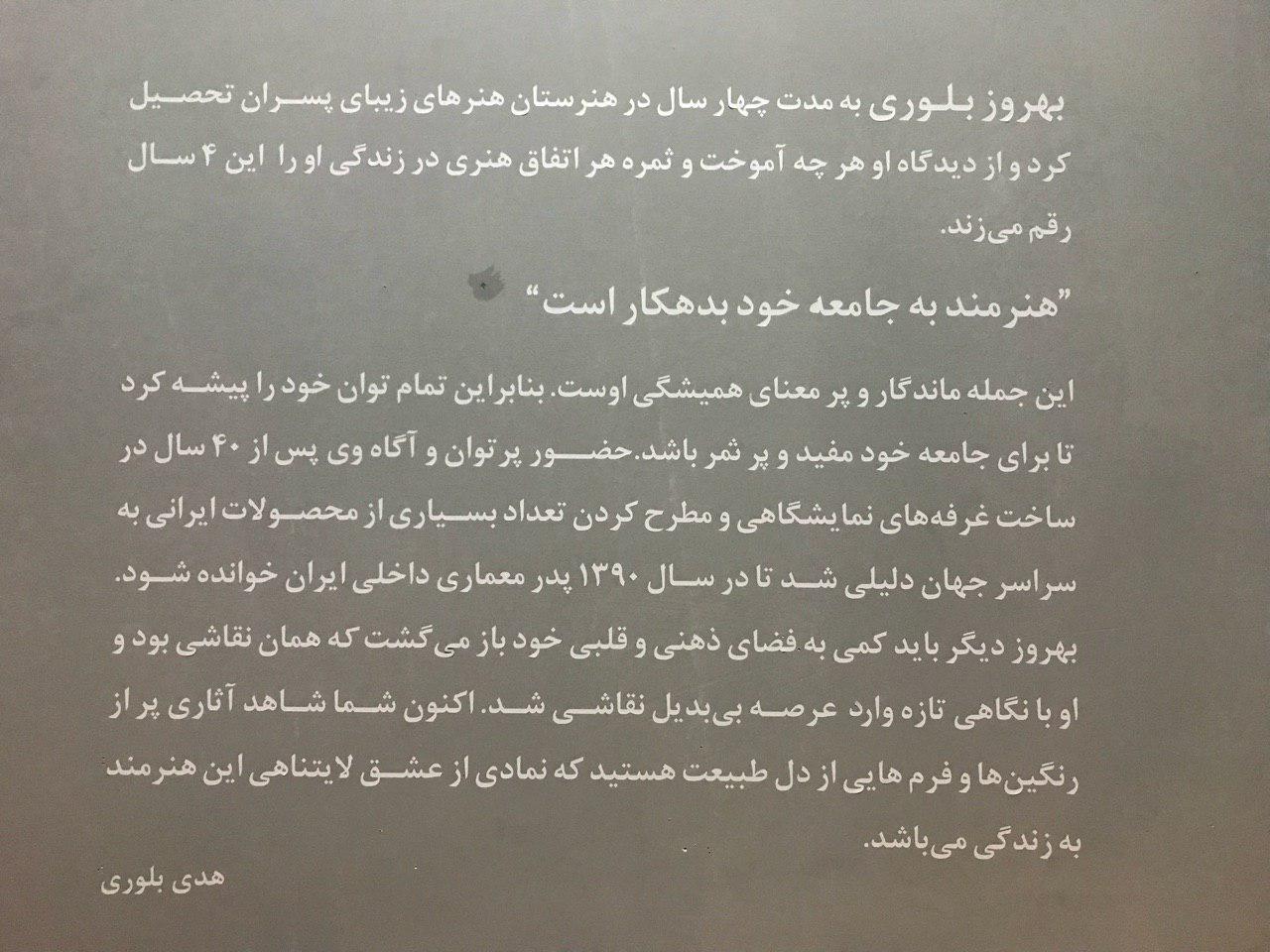 گالري ايده از روز جمعه 26 بهمن ماه ميزبان نقاشي هاي بهروز بلوري شده است.