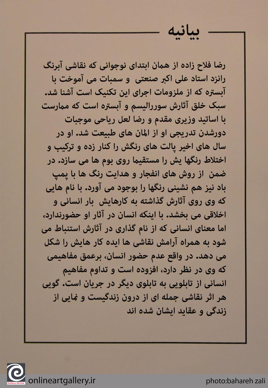 نگارخانه فلاح زاده با ديزاين و مديريتي جديد از روز جمعه سوم اسفندماه با نمايش آثار منتخب ۵ سال اخير رضا فلاح زاده و گنجينه گالري افتتاح شد و تا ۲۴ اسفندماه داير خواهد بود.