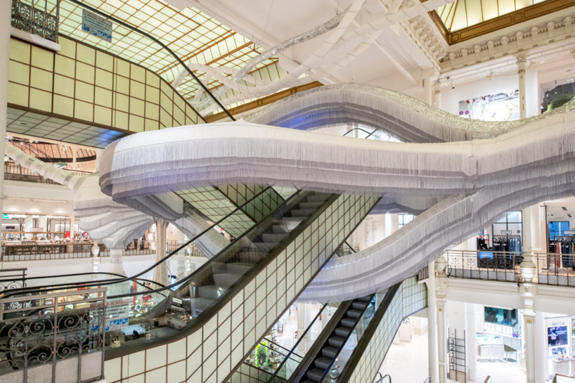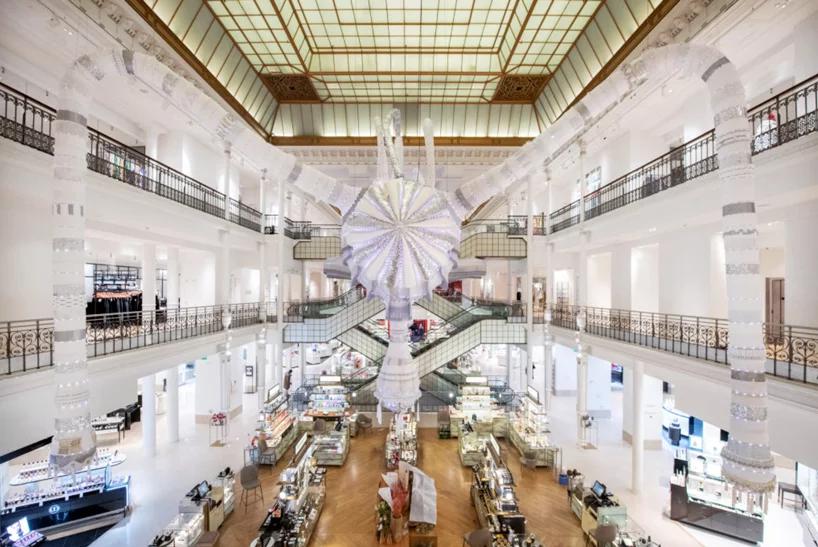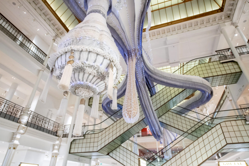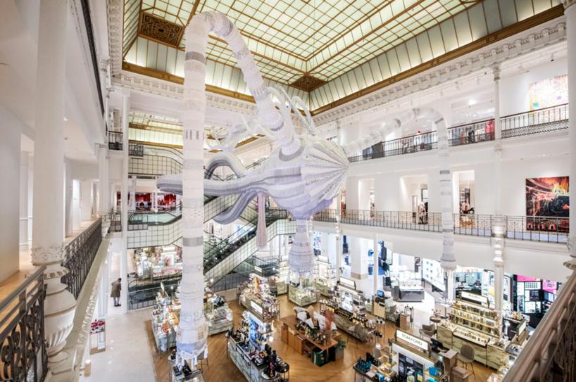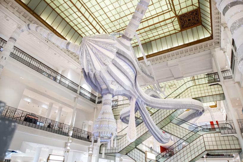 هنرمند پرتغالي joana vasconcelos يک مجسمه عظيم پارچه اي در فروشگاه parisian department خلق کرده است.