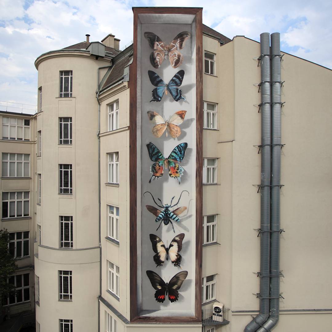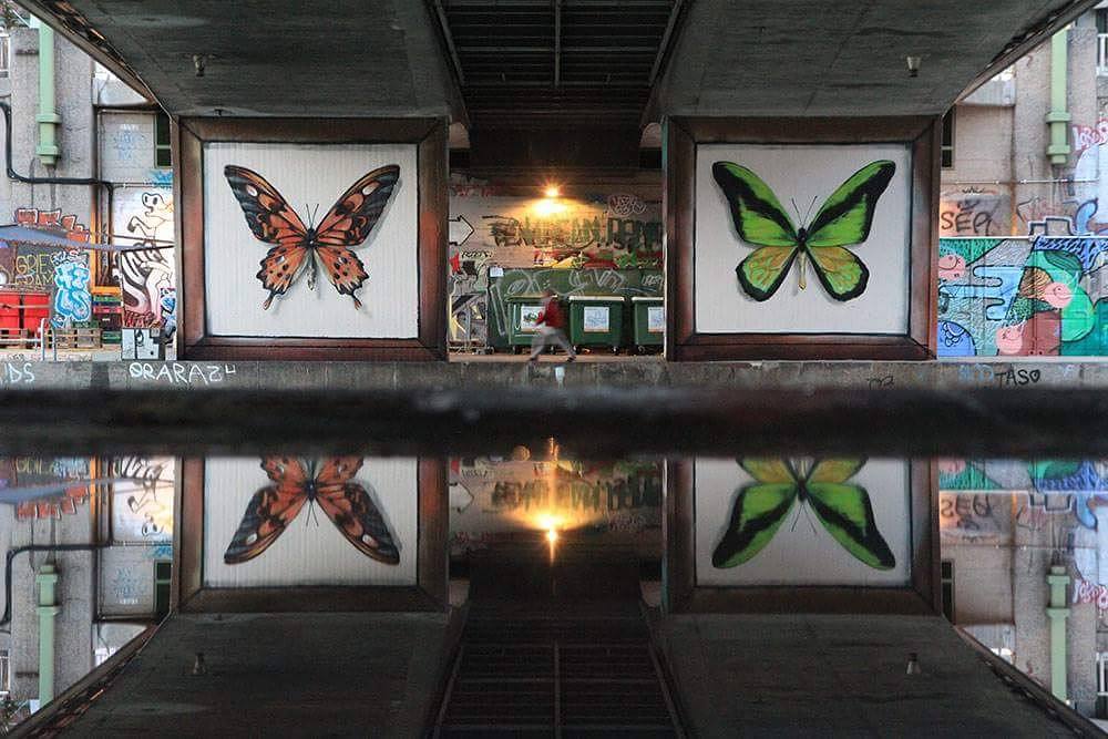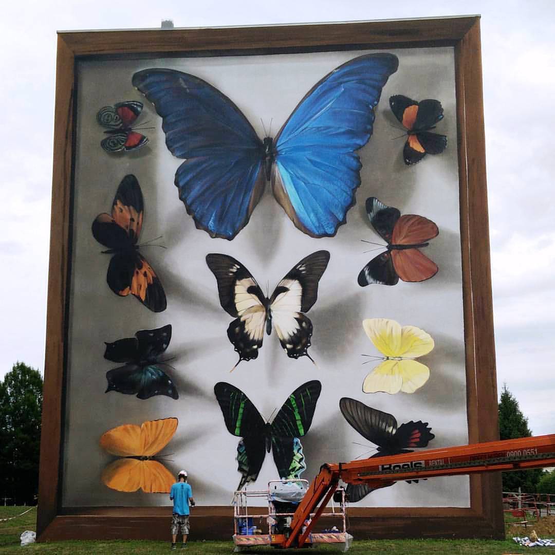 هنرمند مستقر در فرانسه Mantra، مجموعهاي از نقاشيهاي بسيار واقع گرايانه را رونمايي کرد که نماهاي ساختمانهاي تجاري و مسکوني را به نمايشگاههاي بزرگ پروانهها در کشورهاي مختلف مانند اسپانيا، اتريش، فرانسه، و بوگوتا تبديل کرد.