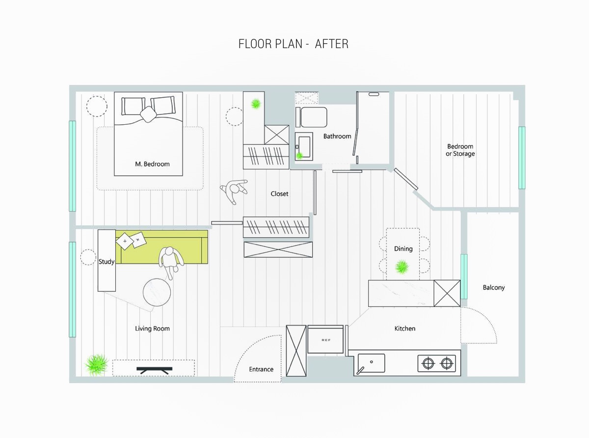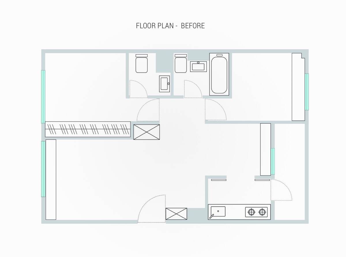 طرح اصلي و پلان در دکوراسيون اين خانه در ابتدا قبل از بازسازي شامل دو اتاق خواب، دو اتاق نشيمن و دو حمام بود که اين اتاقها توسط تيم طراحي، طراحي شده بودند تا با عادات زندگي اين خانواده آرامشي را ايجاد کنند اما در طراحي جديد دکوراسيون، در نزديکي آشپزخانه نشيمن حذف شده و فضاي بازي به عنوان غذاخوري در نظر گرفته شده است که براي اين تغييرات در بازسازي تغييراتي در ابعاد و فرم ديوارهاي اتاق براي عملکرد موثرتر ايجاد شده است و مابين نشيمن و آشپزخانه قفسه هايي باز براي ذخيره سازي اقلام دکوري و کتاب ها در نطر گرفته شده است.