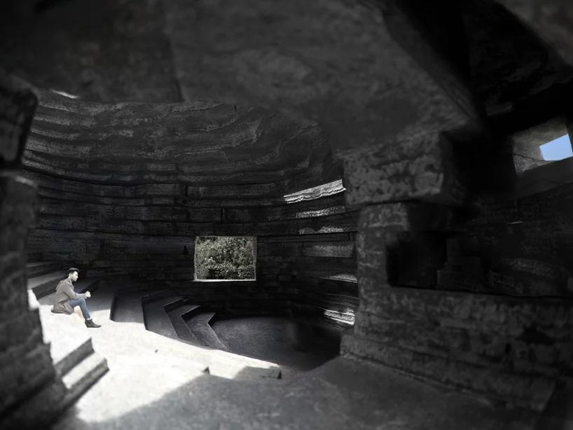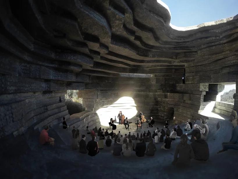 به گزارش گالري آنلاين، اين فضا به طور کامل از بتن و سنگ‌هاي معدني آسيب‌ ديده ساخته‌شده، شکل ساختار مخروطي وارونه براي ارتقاي آکوستيک (acoustics) است.