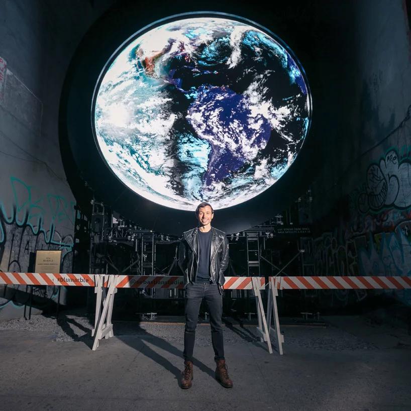 به گزارش گالري آنلاين، اين اثر توسط sebastian errazuriz تحت عنوان "blu marble" خلق شده است. اين اثر شامل يک صفحه LED و يک ربات هوشمند است که توسط errazuriz و تيمش ساخته شده است. اين روبات تلاش ميکند تا عکسهاي زنده گرفته شده از ماهواره را، با استفاده از يک برنامه ويژه با يک توالي ويدئويي زنده نمايش دهد.