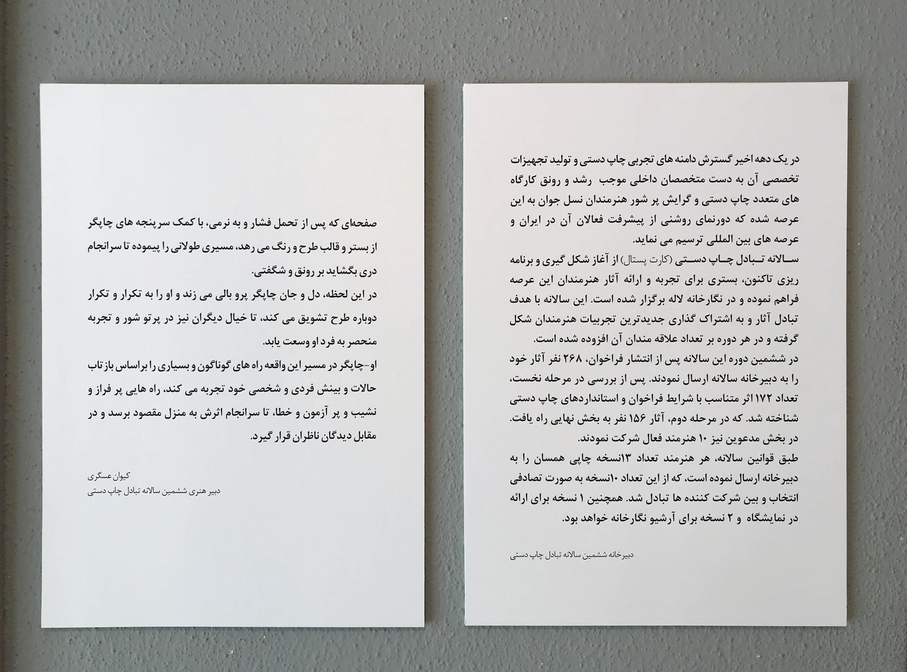 شايان ذکر است، دبيري ششمين سالانه تبادل چاپ دستي، بر عهده کيوان عسگري (هنرمند معاصر و مدرس هنر) بوده است.