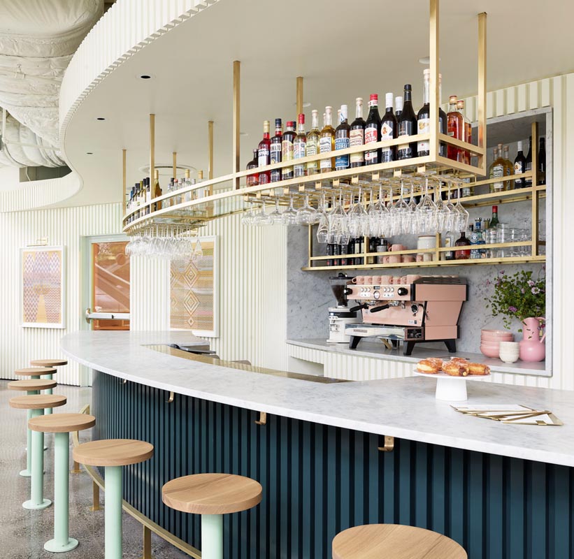 مي توان گفت ايده طراحي از سکه گرفته شده، که در داخل و خارج رستوران قابل مشاهده است. از سنگ مرمر ايتاليايي براي ميزهاي پيشخوان استفاده گرديده و ديوارهاي داخلي رنگ هاي سفيد و صورتي دارند.