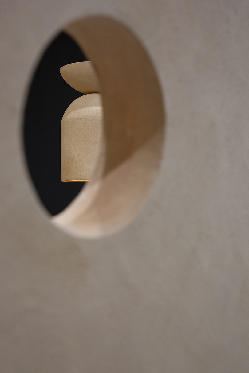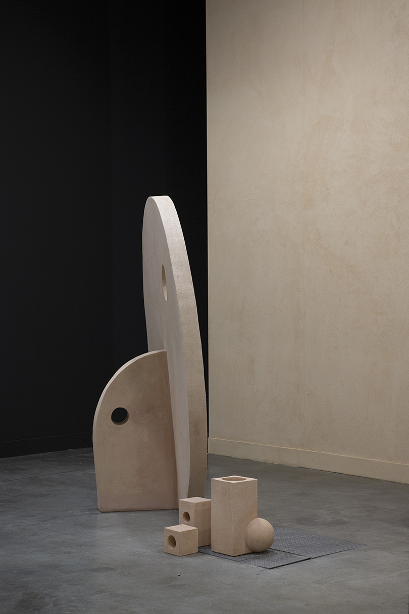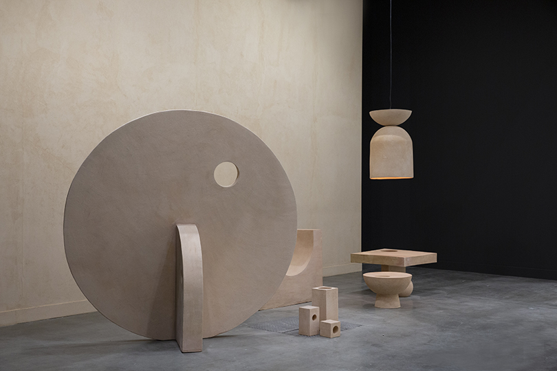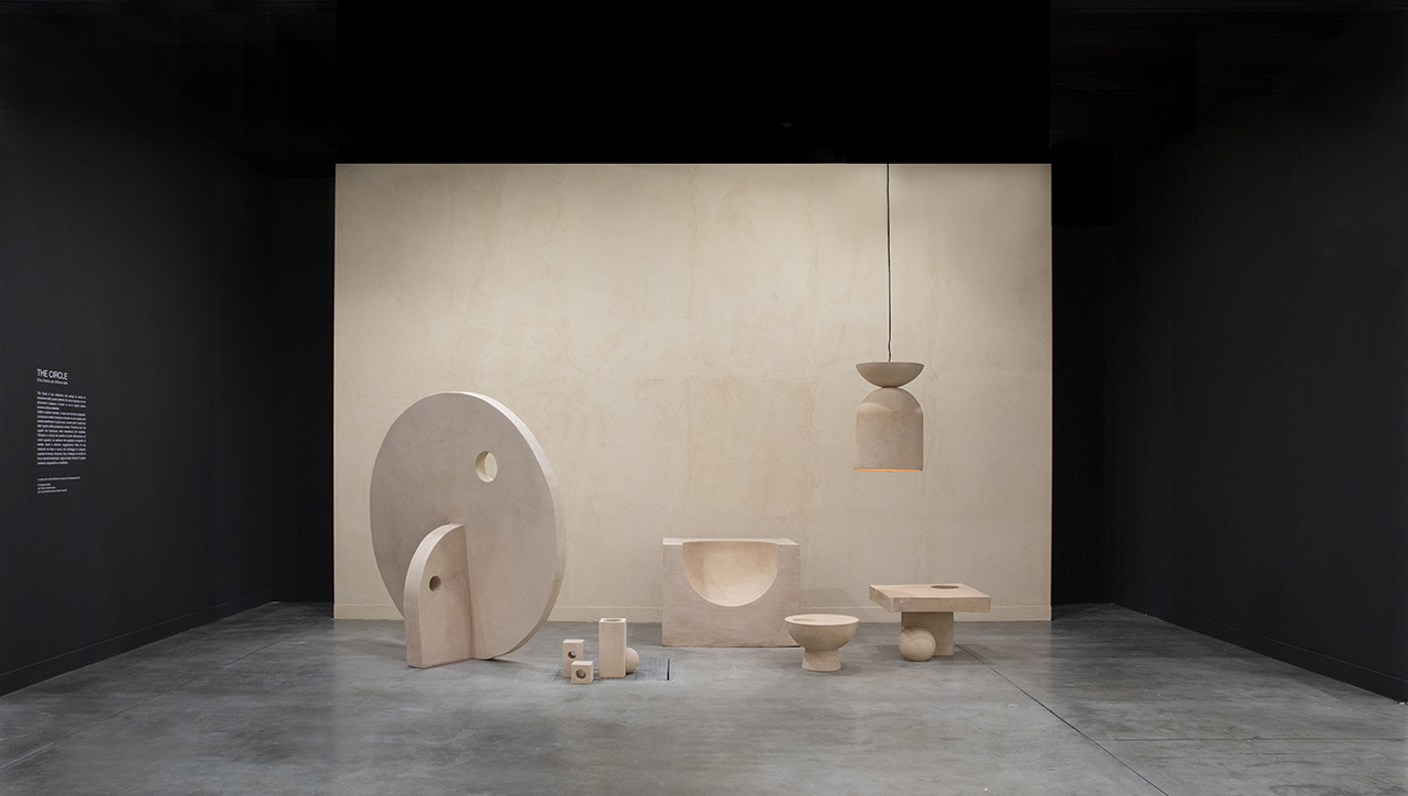 مجموعه دايره شامل صندلي، لامپ، صفحه نمايش و ميز است و همه از خاک رس ساخته شده اند. رنگ خنثي همراه با اشکال هندسي ساده و رابطه بين خطوط و منحني ها براي همساني با ساختارهاي معماري استفاده شده است.
