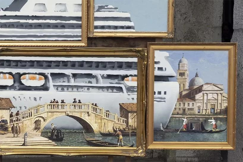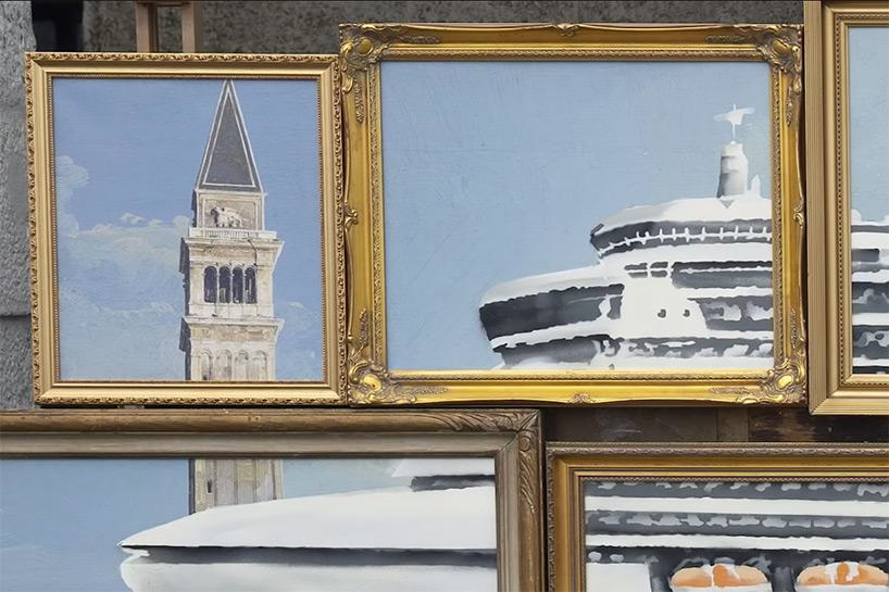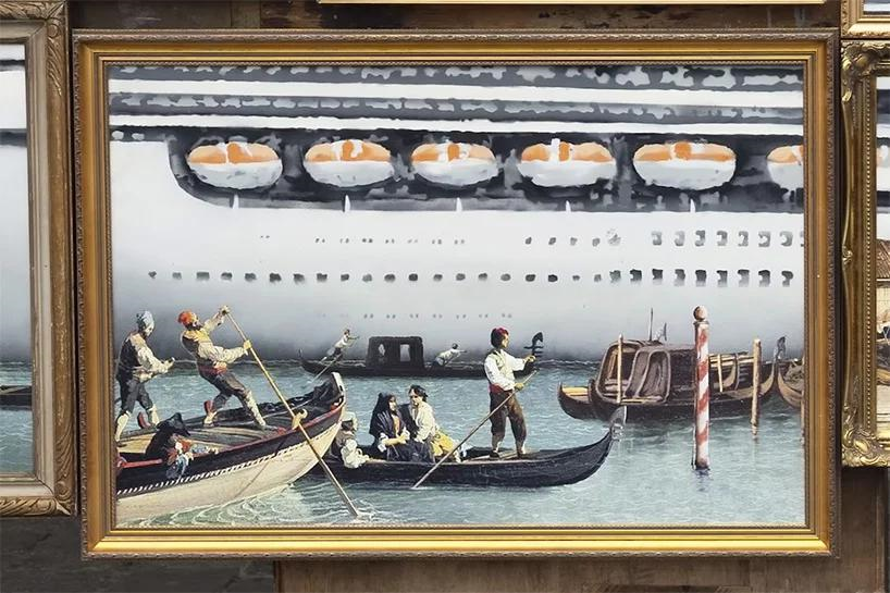 به گزارش گالري آنلاين، اين هنرمند گمنام نوشته است: در حاشيه دوسالانه ونيز دکه خودم را راه مياندازم. با وجود اينکه دوسالانه ونيز جزء بزرگترين و بلندآوازه ترين رويدادهاي جهاني است اما به دلايلي من براي حضور در آن دعوت نشدم. اين ويدئوي يک دقيقه اي مردي نامشخص را نشان ميدهد که تابلوهاي نقاشي رنگ روغن را در خيابانهاي شهري در ايتاليا به پا مي کند. زمانيکه اين تابلوها کنار هم گذاشته شدند اين تصاوير کشتي هاي کروزي که همواره مورد بحث بوده اند را نشان مي دهد که نماي شهر پرشکوه ونيز را کم اهميت جلوه مي دهد و در همان حال راهشان را به سمت کانال بزرگ مي پيمايند.