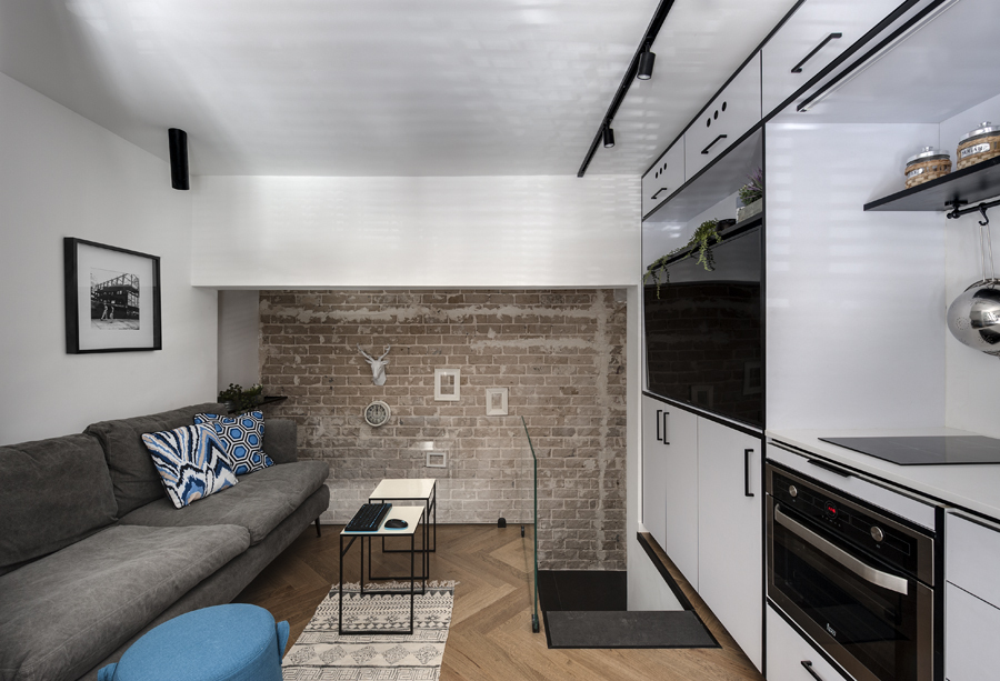 طراحي داخلي اين آپارتمان توسط Nitzan Horovitz صورت گرفته و با چالش هاي پيش رو، طراحي و اجرا را ماجراجويي منحصر به فرد اما مشکل دانسته اول، به دليل فضاي کوچک و دوم به دليل ماهيت مشکل ساز آن.
