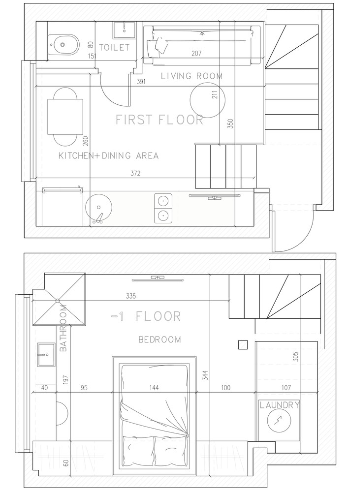در طبقه زيرين، تخت خواب، ميز کنار تختي، ماشين لباسشويي و خشک کن، دوش و يک اتاق ذخيره سازي کوچک وجود دارد. همينطور يک ميز چوبي به عنوان يک ميز ناهار خوري يا ميز کاري کوچک قرار گرفته است.
