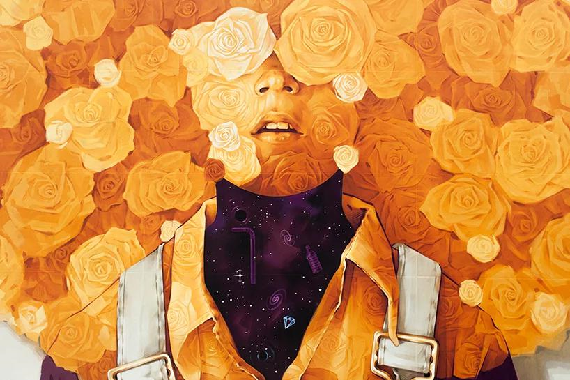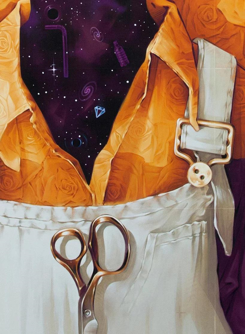 گردن و سينه سوژه اين اثر با ستارهها و فضاي سياه و چشمان او از گل هاي درخشان پوشيده شدهاند.