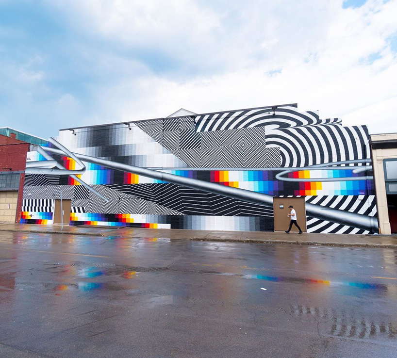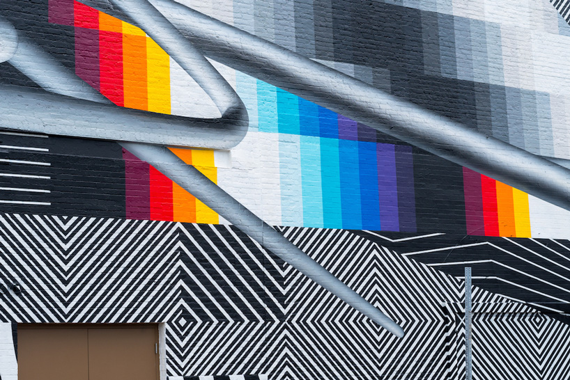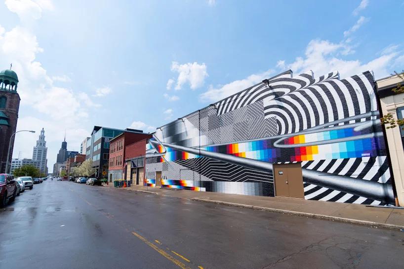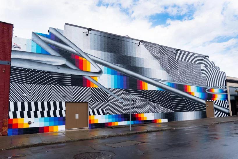 اثر هنري felipe pantone در مقياس بزرگ بر ديواري از سالن کنسرت نيويورک مجموعه اي است از الگوهاي هندسي سياه و سفيد و رنگين کماني از پيکسل هاي درشت.