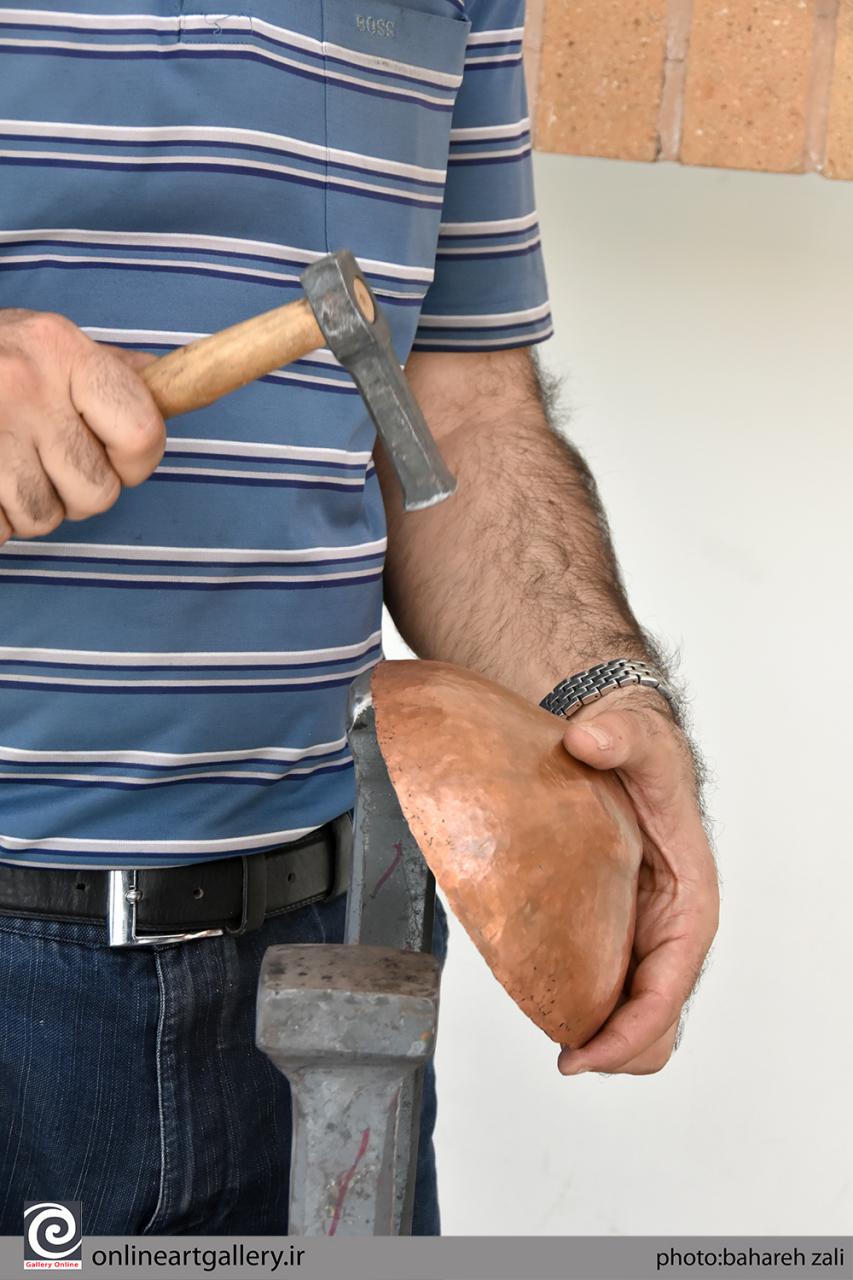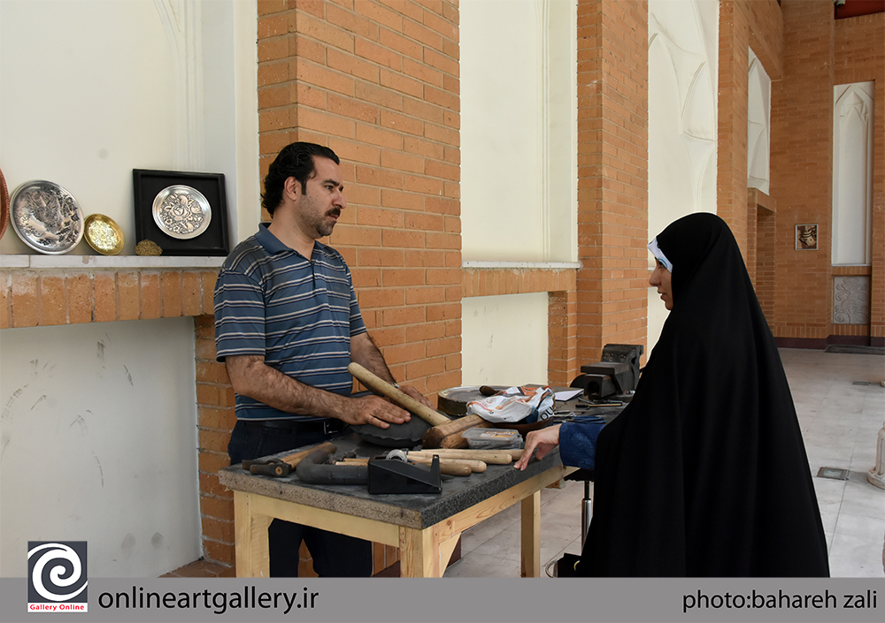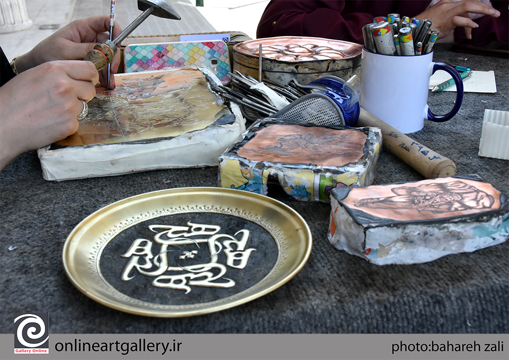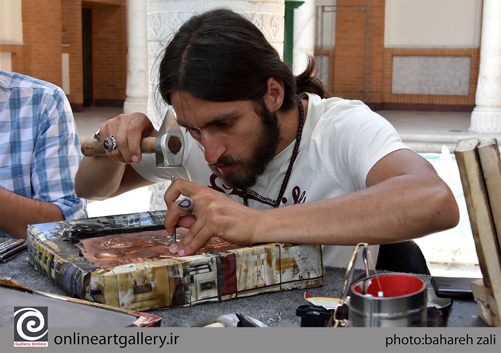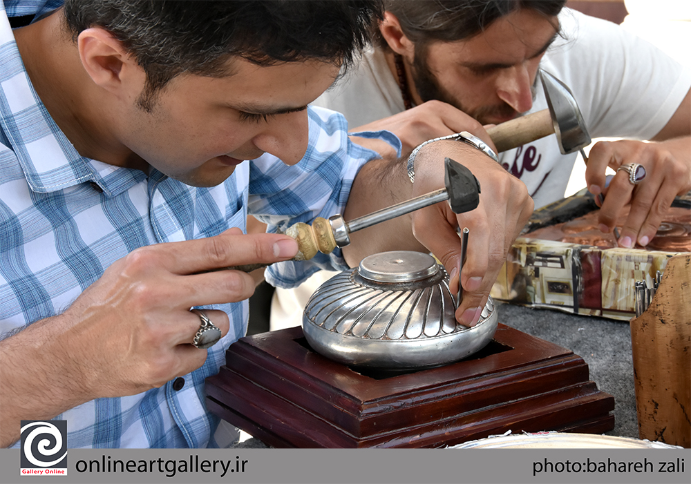 نرسيده به خيابان طالقاني در رواق هنرِ فرهنگستان صبا منبع صدا نمايان مي شود، چکش هايي که با دست هنرمندان پشت ميز در کنار حوض رواق بر صفحه هاي مسي، برنج و نقره اي فرود مي آيند.