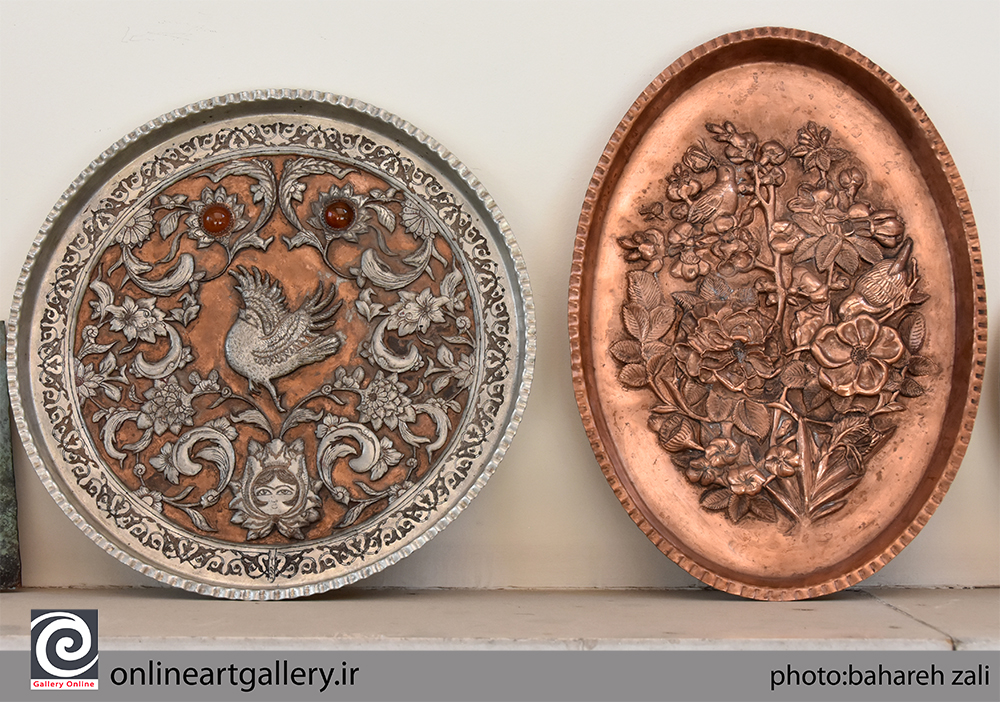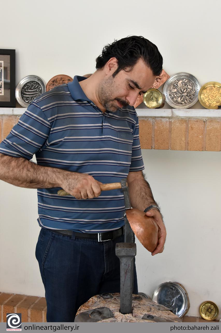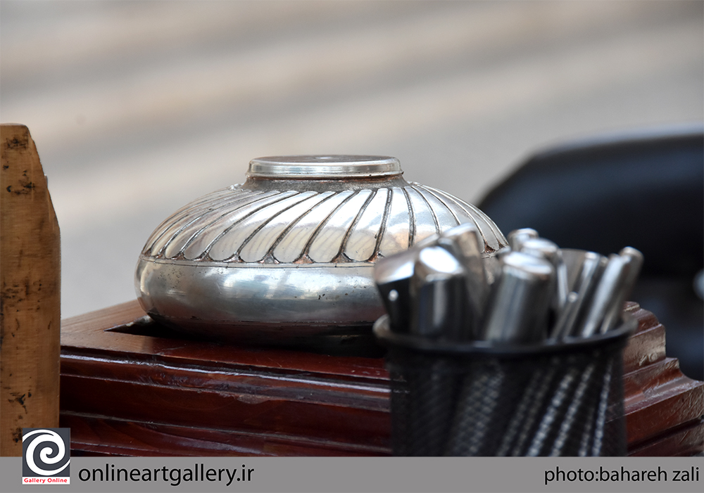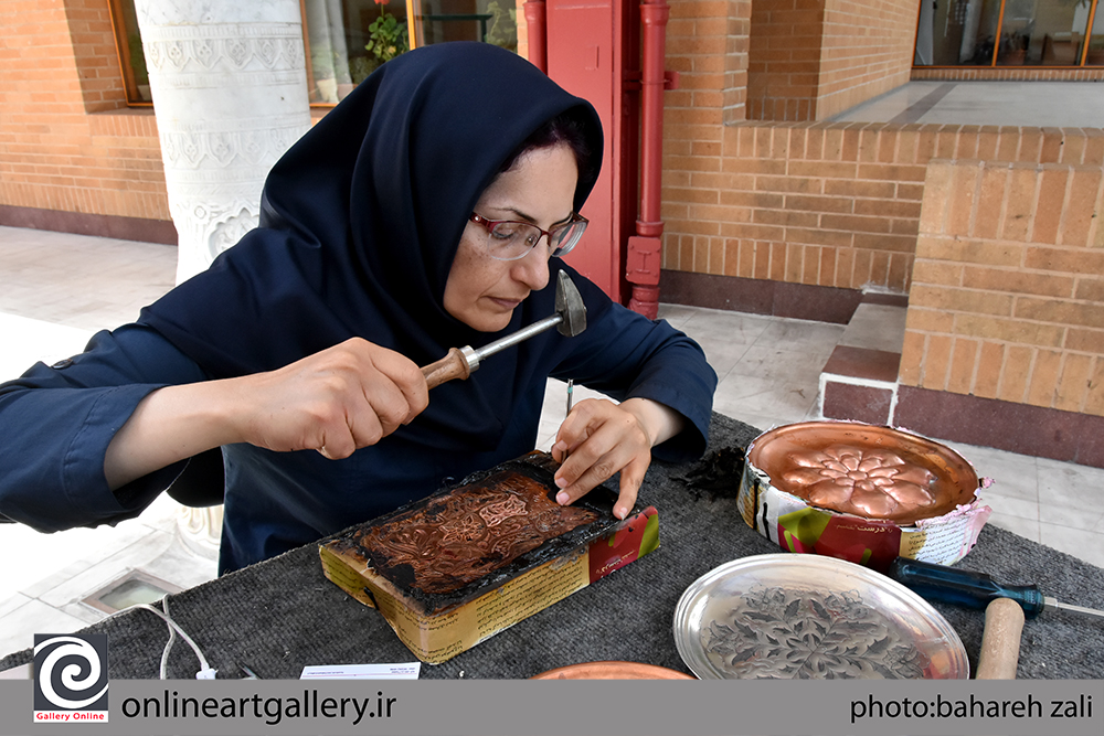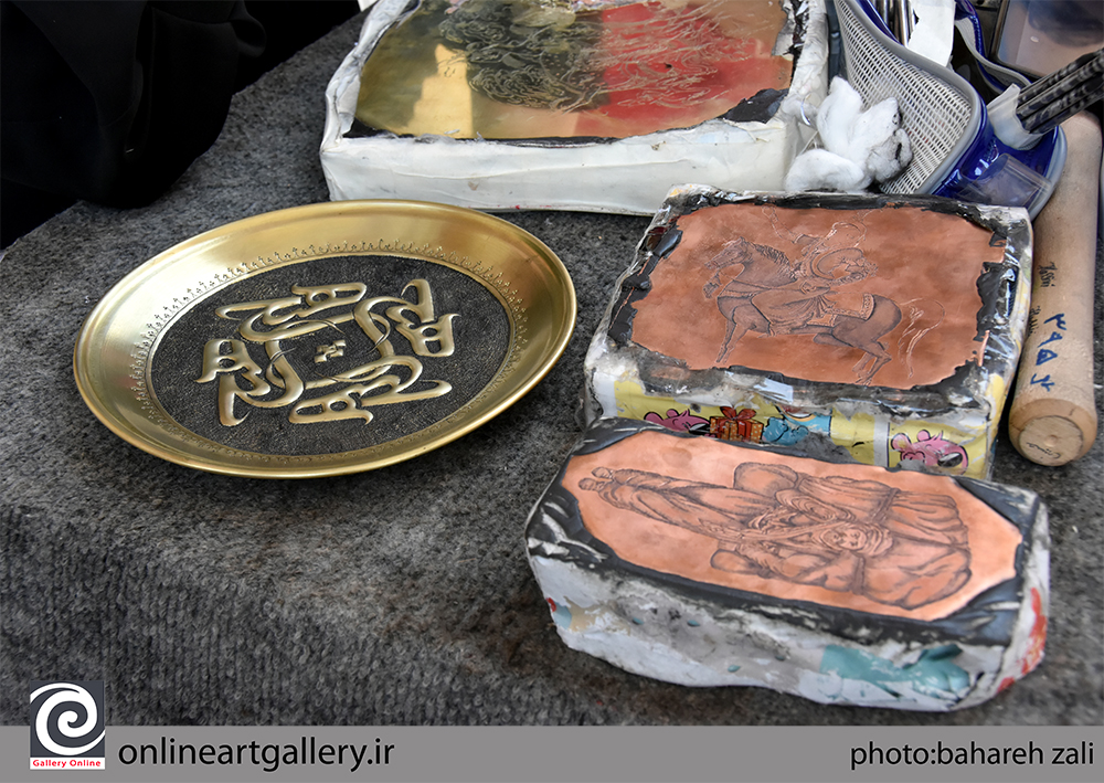 نرسيده به خيابان طالقاني در رواق هنرِ فرهنگستان صبا منبع صدا نمايان مي شود، چکش هايي که با دست هنرمندان پشت ميز در کنار حوض رواق بر صفحه هاي مسي، برنج و نقره اي فرود مي آيند.