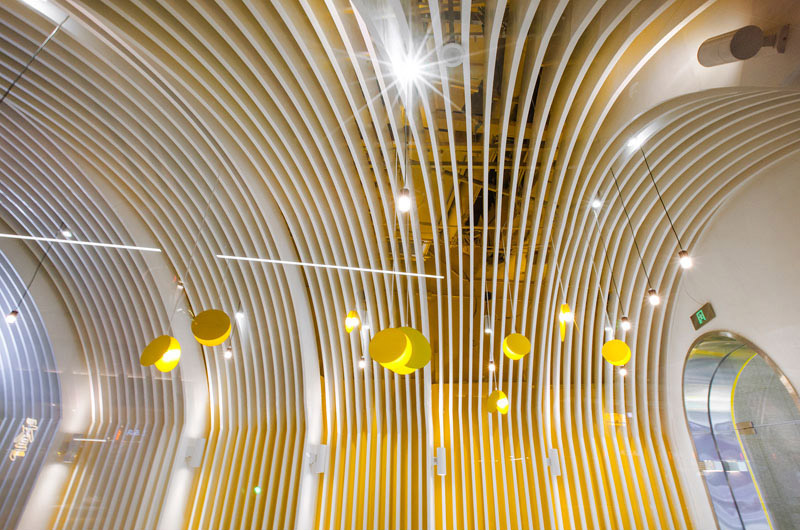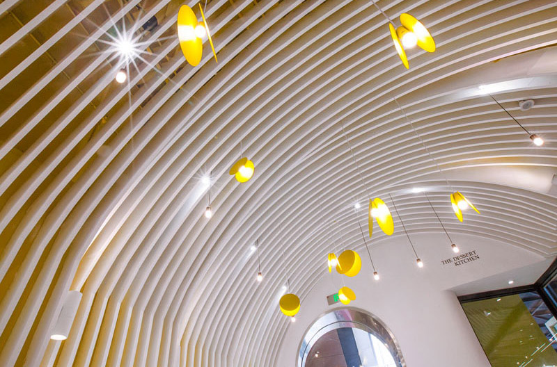 در داخل کافه، Towodesign از عناصر گنبدي شامل چندين غرفه استفاده نموده؛ و حالت آرکي و قوس مانند در سقف نيز به مخفي نمودن تاسيسات و دريچه هاي تهويه مطبوع کمک کرده است.