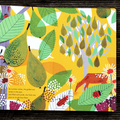 تصاوير توسط يک متن که خلاصه ايست از تغييرات فصل ها با ريتمي ملايم دسته بندي شده است و تمرکز خواننده ي جوان را به تغييرات کليدي درخت گلابي کوچک جلب ميکند.