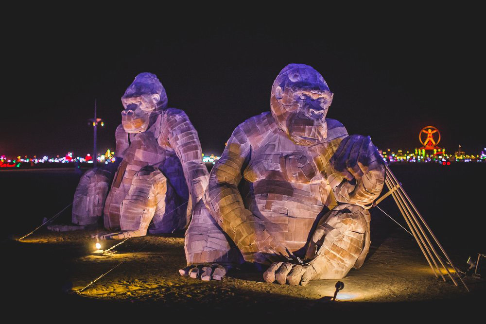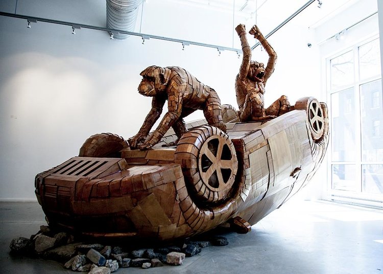 آثار لورنس والريس که اغلب بزرگتر از اندازه طبيعي ساخته مي شوند عبارتند از اتومبيل، شامپانزه، رينوکري، فيل و خرس.