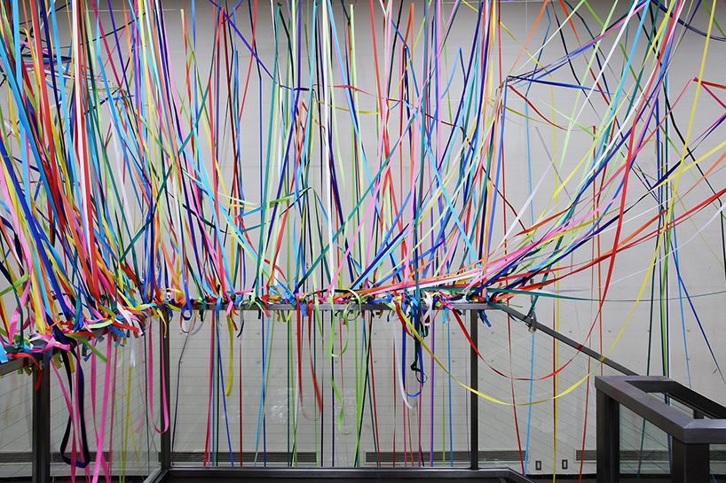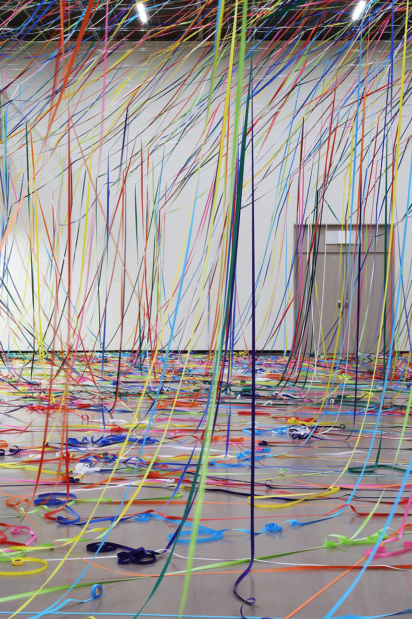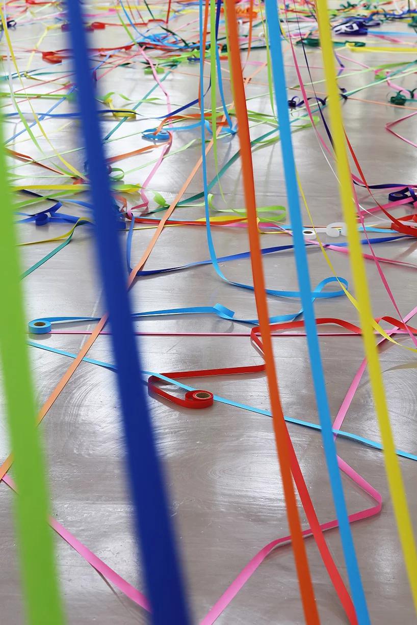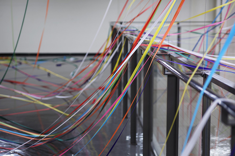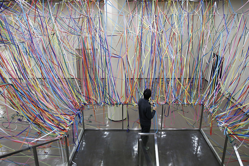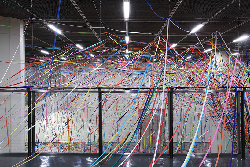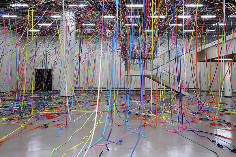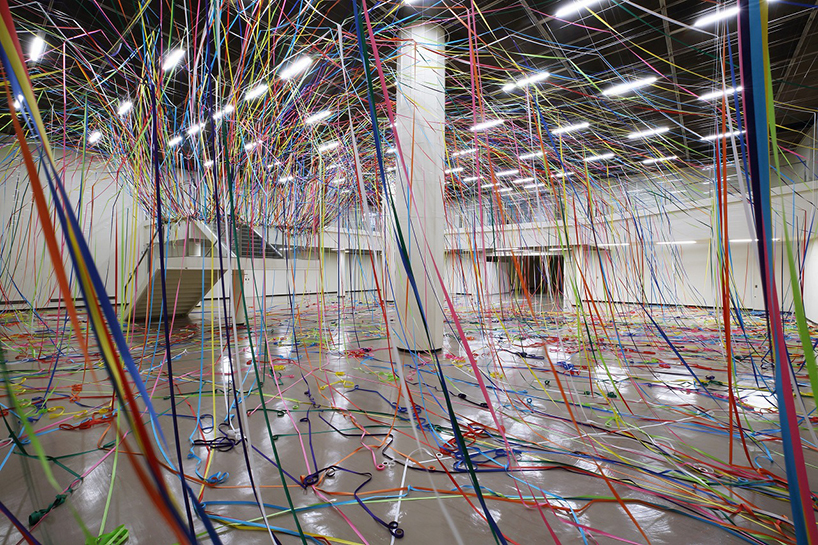 طناب هاي رنگي ماهيگيري و رول هاي کاغذ رنگي به شيوه يک نقاشي آبستره اکسپرسيونيت توسط  yasuaki onishi در فضاي داخلي يک اتاق نصب شدند.