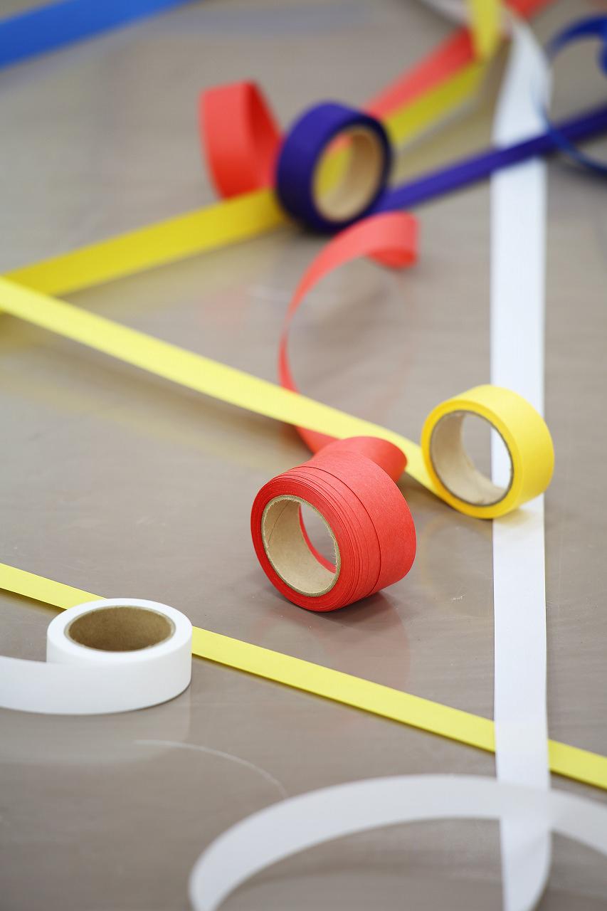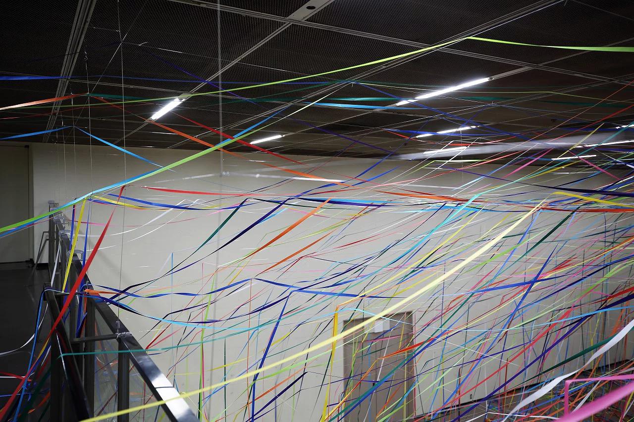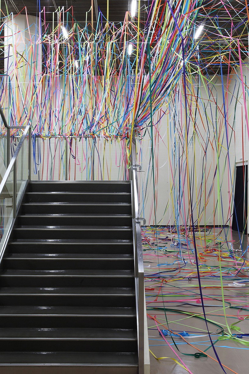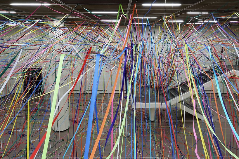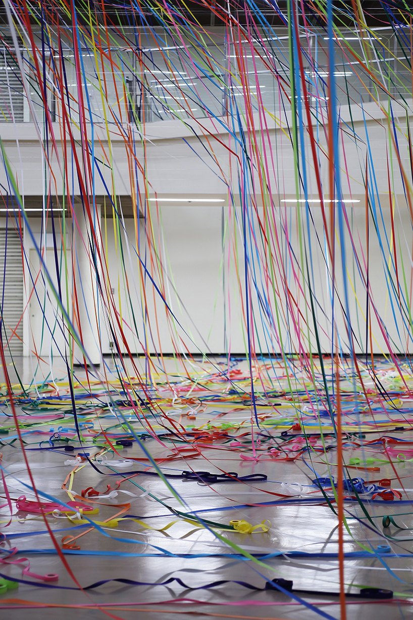 طناب هاي رنگي ماهيگيري و رول هاي کاغذ رنگي به شيوه يک نقاشي آبستره اکسپرسيونيت توسط  yasuaki onishi در فضاي داخلي يک اتاق نصب شدند.