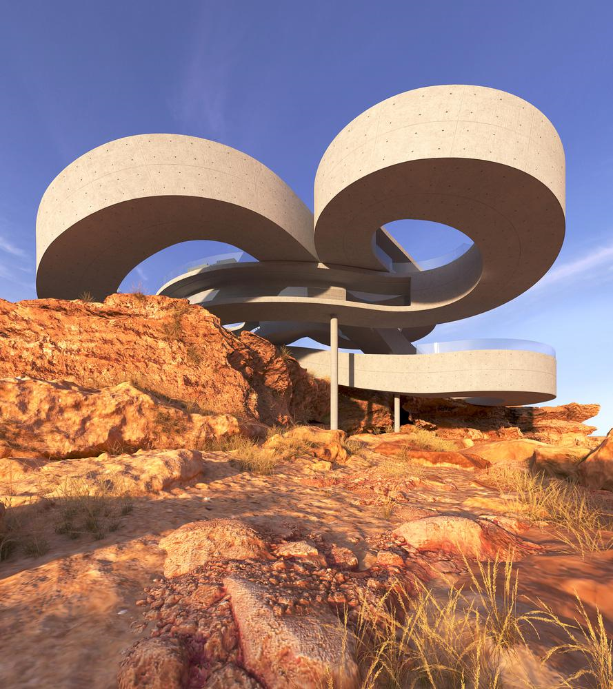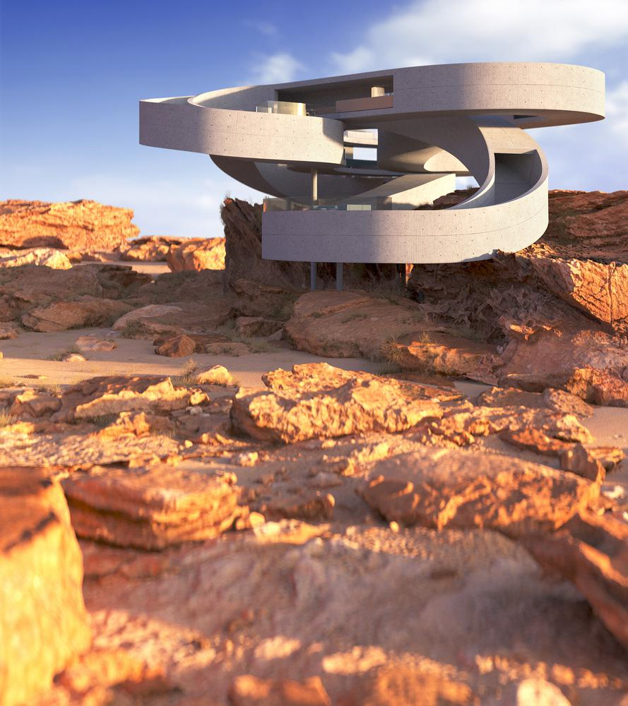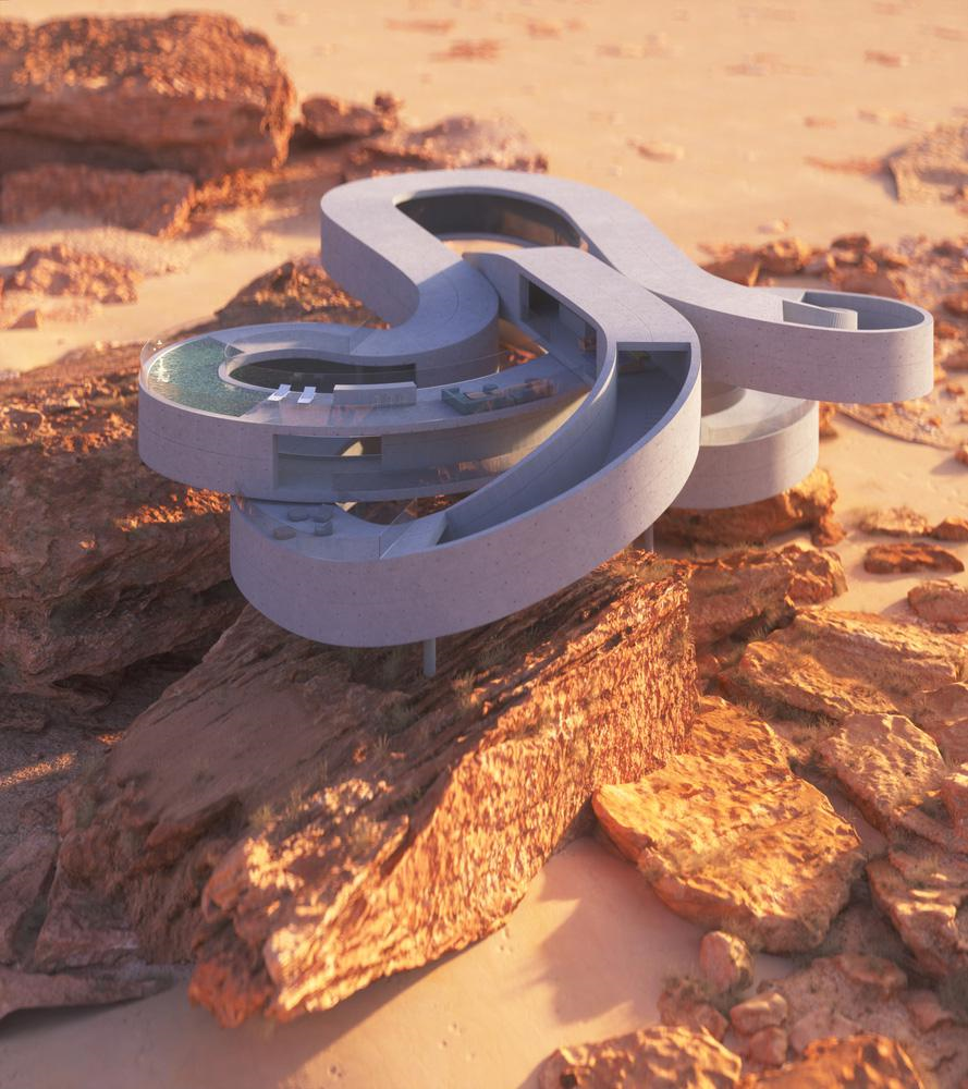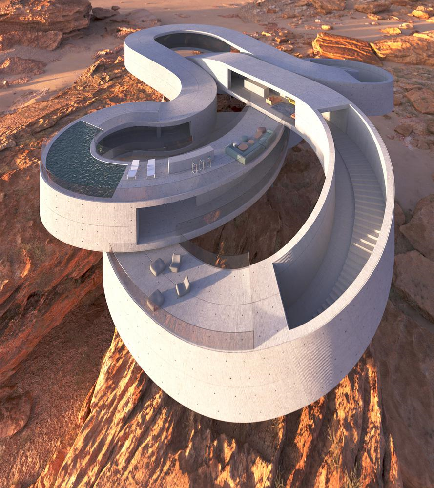 در حالي که خانه داخل يک سنگ قرار دارد، معمار تهيه هندسه هاي طبيعي چشم انداز را مورد بررسي قرار مي دهد،