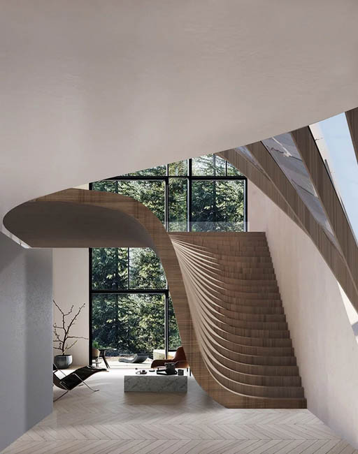 نوع ريتم پله ها در فضاي داخلي و نماي شيشه اي حرکت ديوار ها به سوي سقف را دنبال ميکند و موجب پيوستگي بيشتر فرم در داخل و خارج و ابعاد مختلف بنا ميشود. اين حرکت هاي نرم و دنباله دار در نهايت به استخري ختم ميشود که با فرم مستطيل خود در تضاد با حرکات دوار ديگر قرار مي گيرد و به تنوع عناصر بصري منجر ميشود.