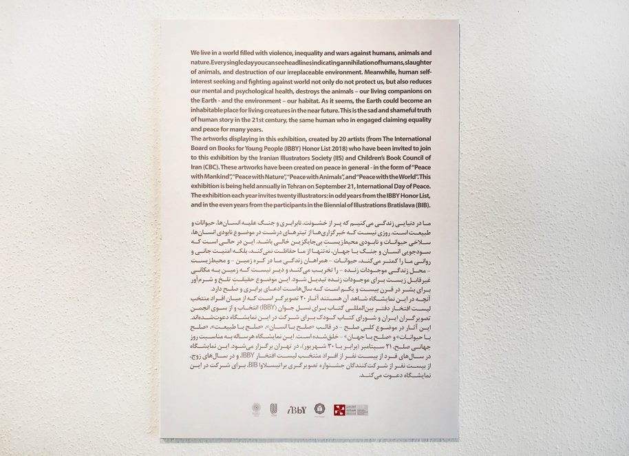 انجمن تصويرگران ايران و شوراي کتاب کودک اولين نمايشگاه«صلح را بايد از کودکي آموخت»،با آثاري از تصويرگران منتخب 21 کشور جهان را در نگارخانه لاله برگزار نمود.