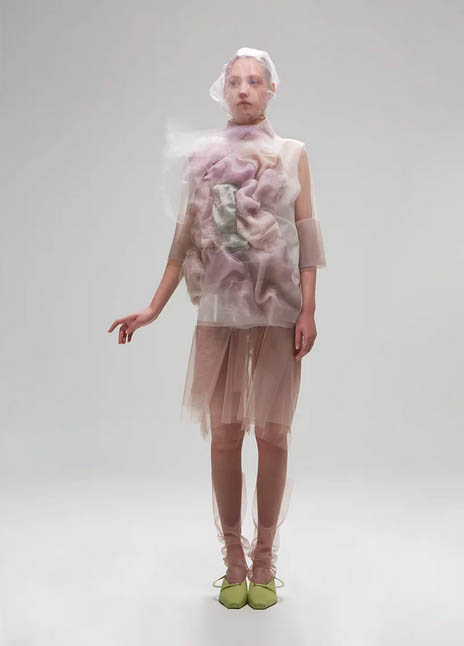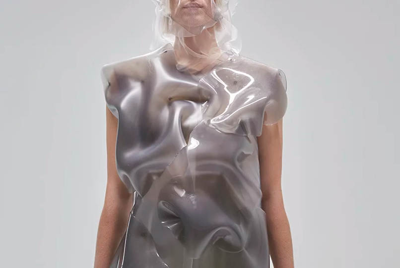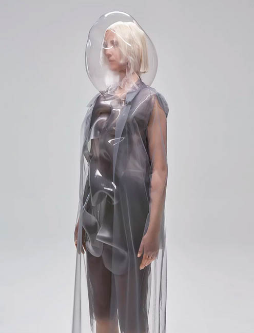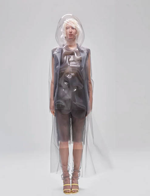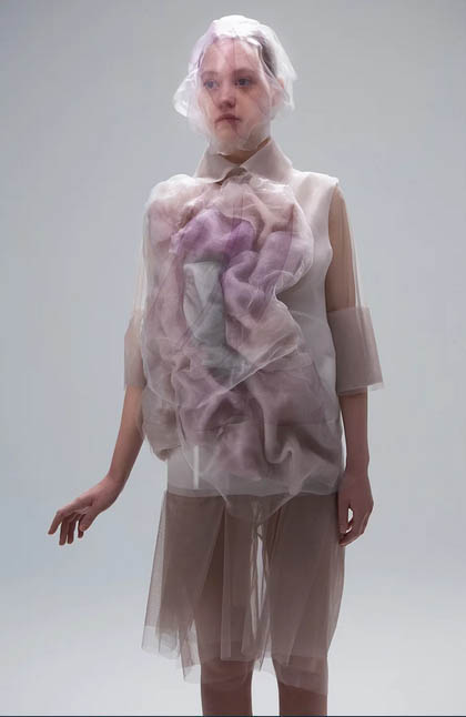 طراح مد ساکن مونترال ying gao، لباس رباتيکي را از سيليکون، شيشه و ارگانزا طراحي کرده است که با اتصال دستگاه هاي الکترونيکي به آن قطعات پوياي در حال تغيير به طيف هاي رنگي اطراف واکنش نشان مي دهند.